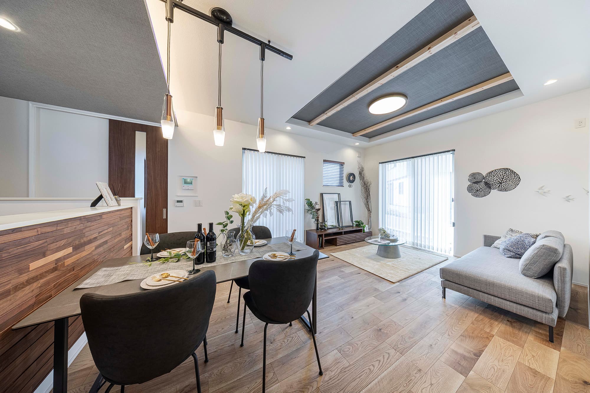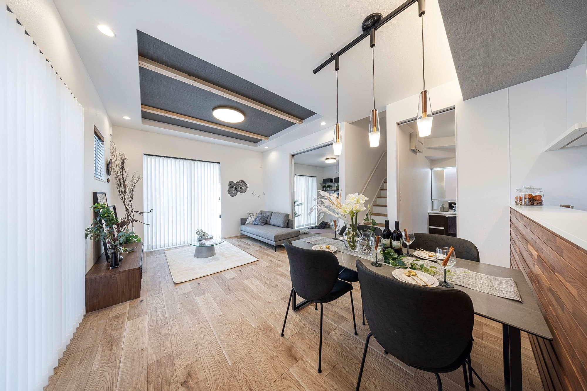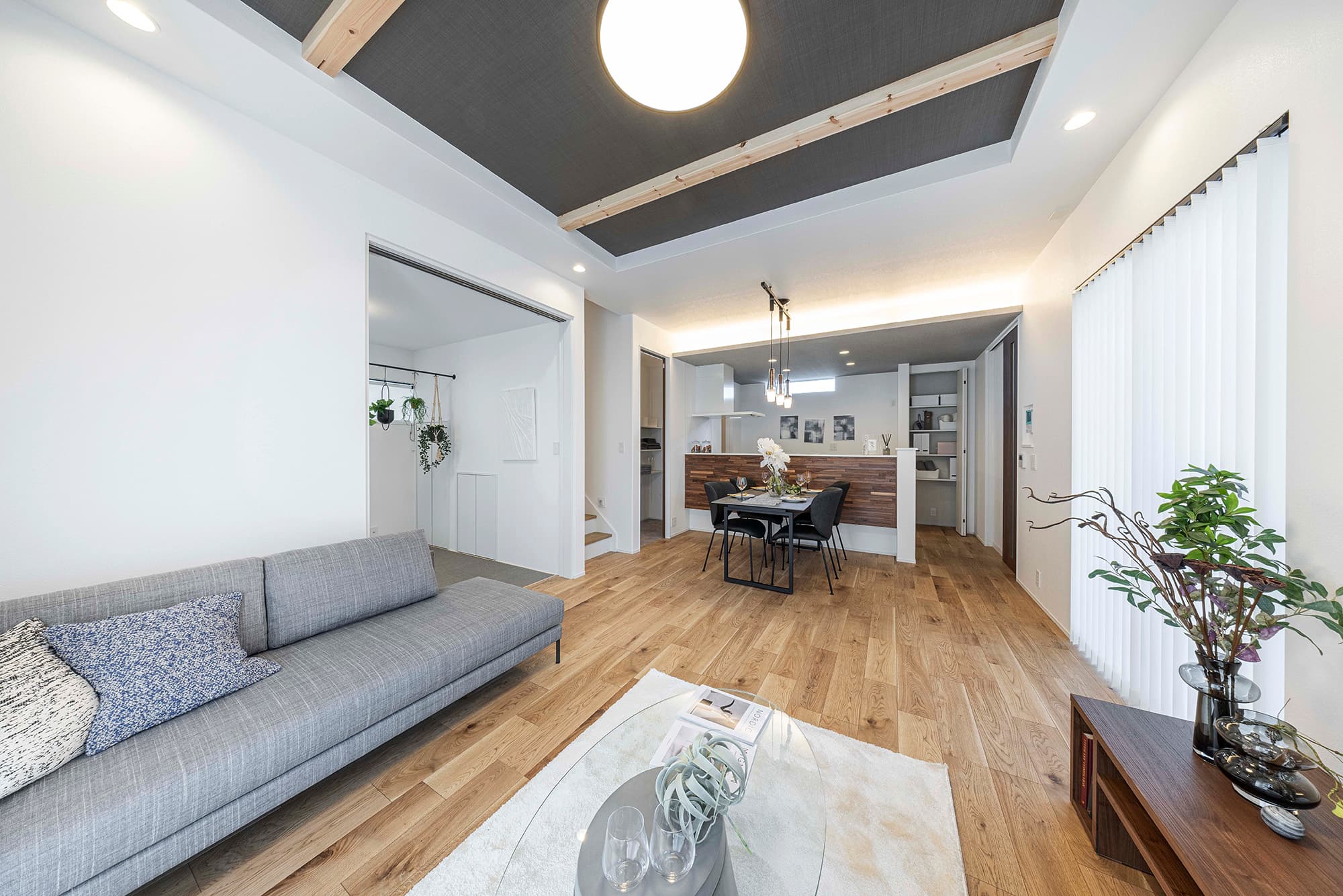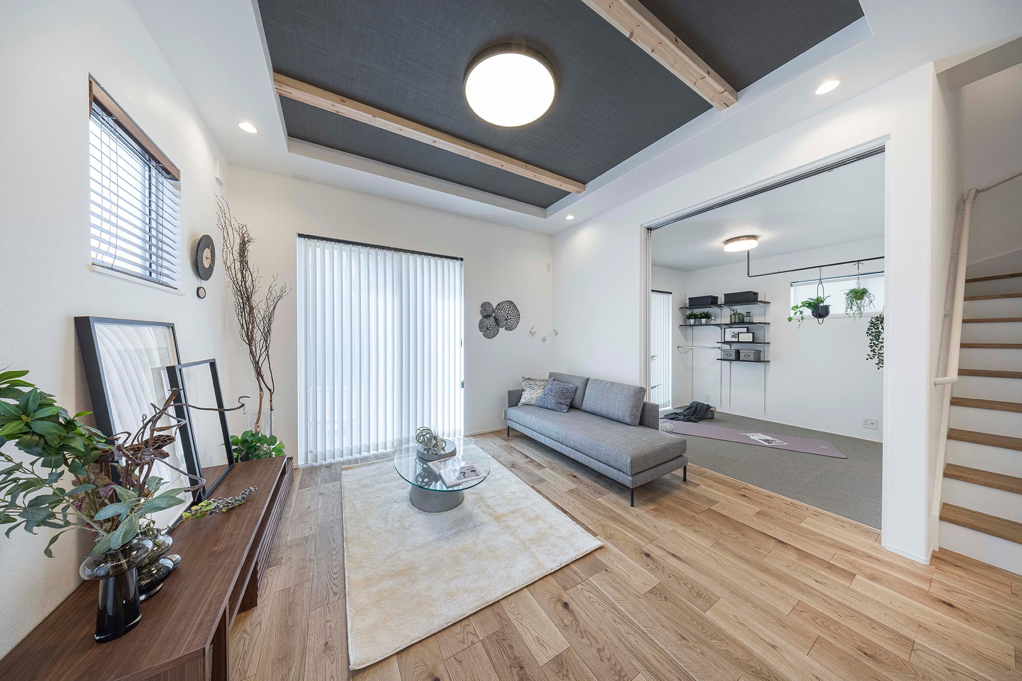 • リビング天井の一部を高くし開放感を演出。アクセントクロスと無垢の梁でお洒落な空間に。