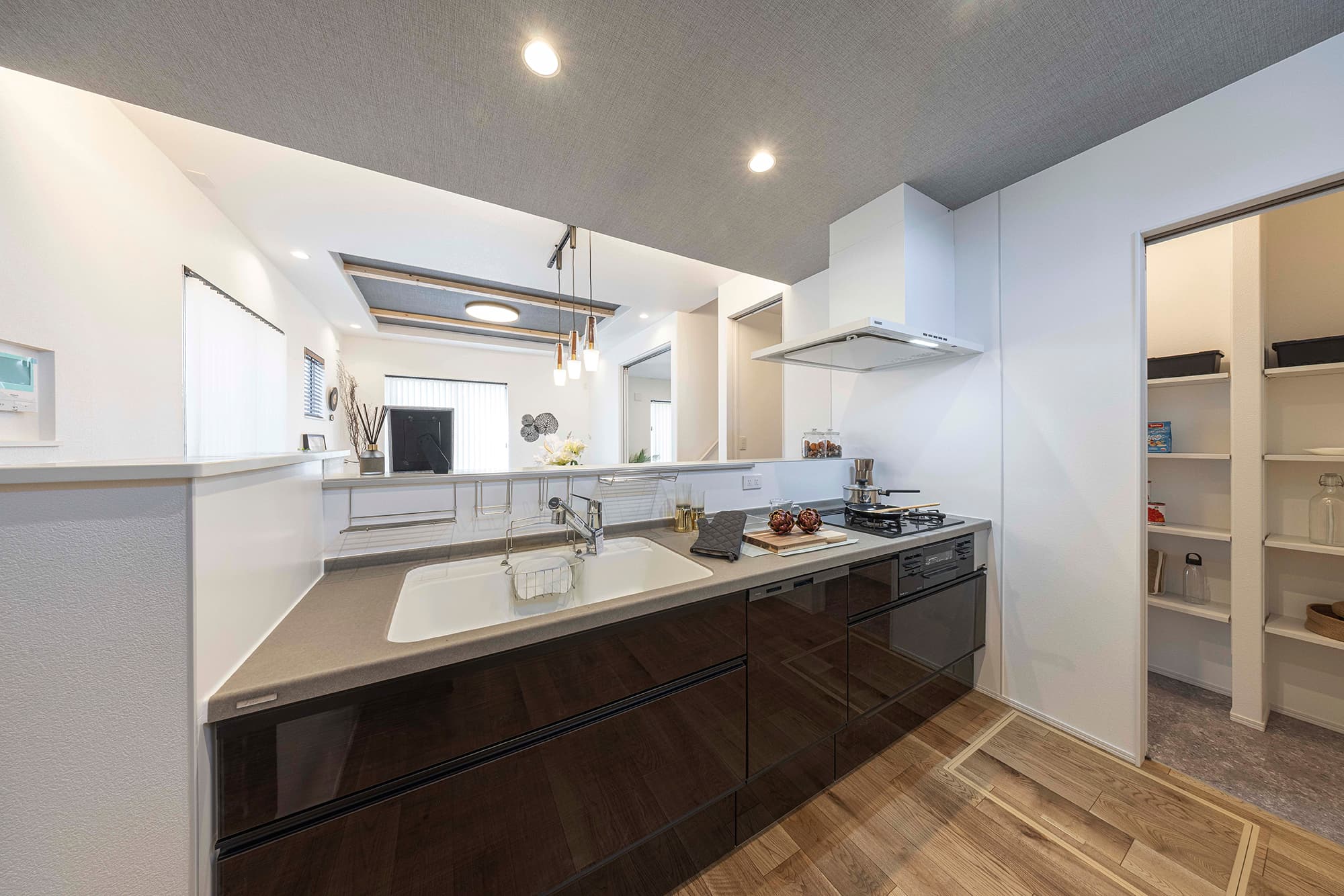 家事効率の良い回遊動線に加え、キッチンと洗面所の間に機能的な収納空間を確保しました。