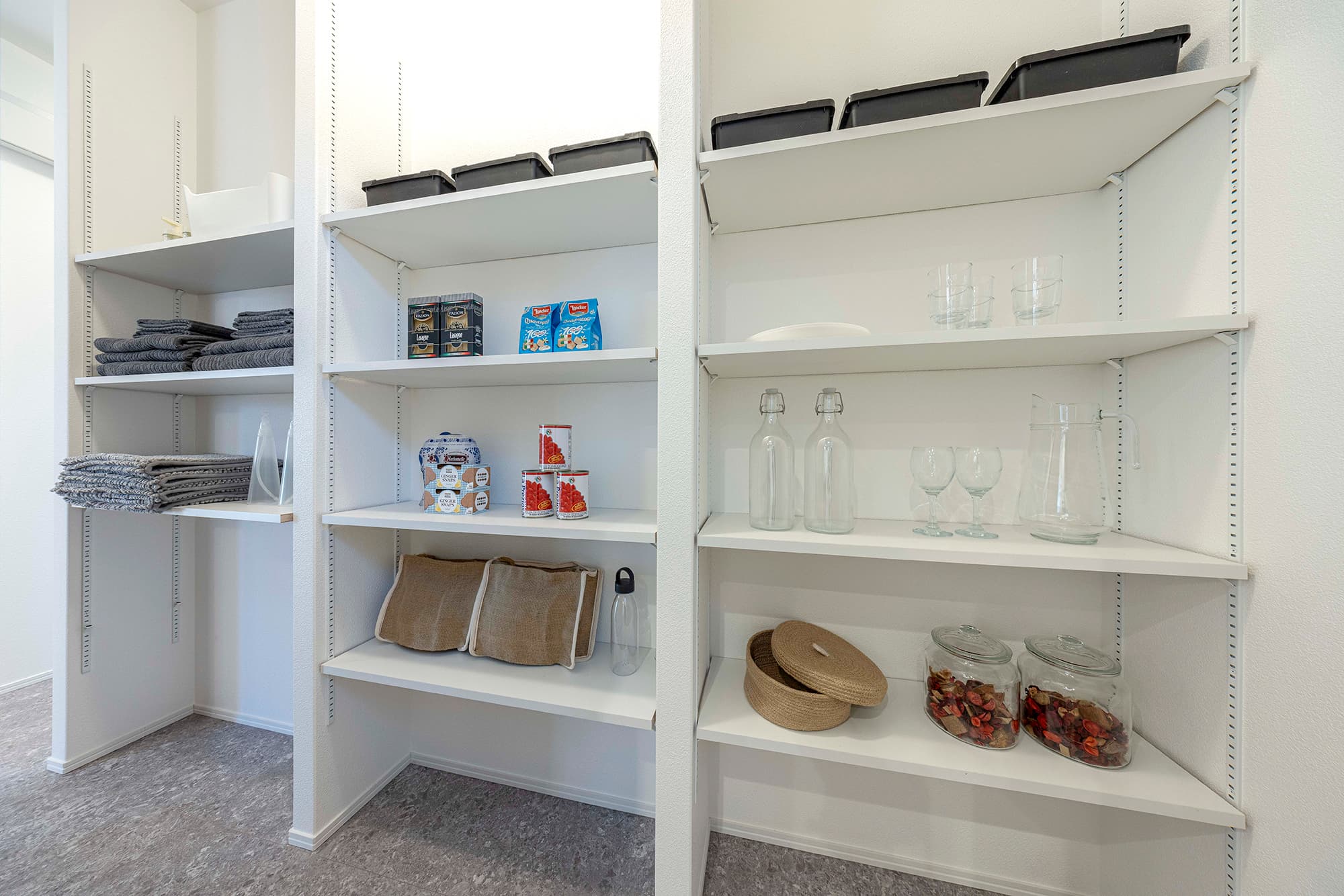 • 家事効率の良い回遊動線に加え、キッチンと洗面所の間に機能的な収納空間を確保しました。