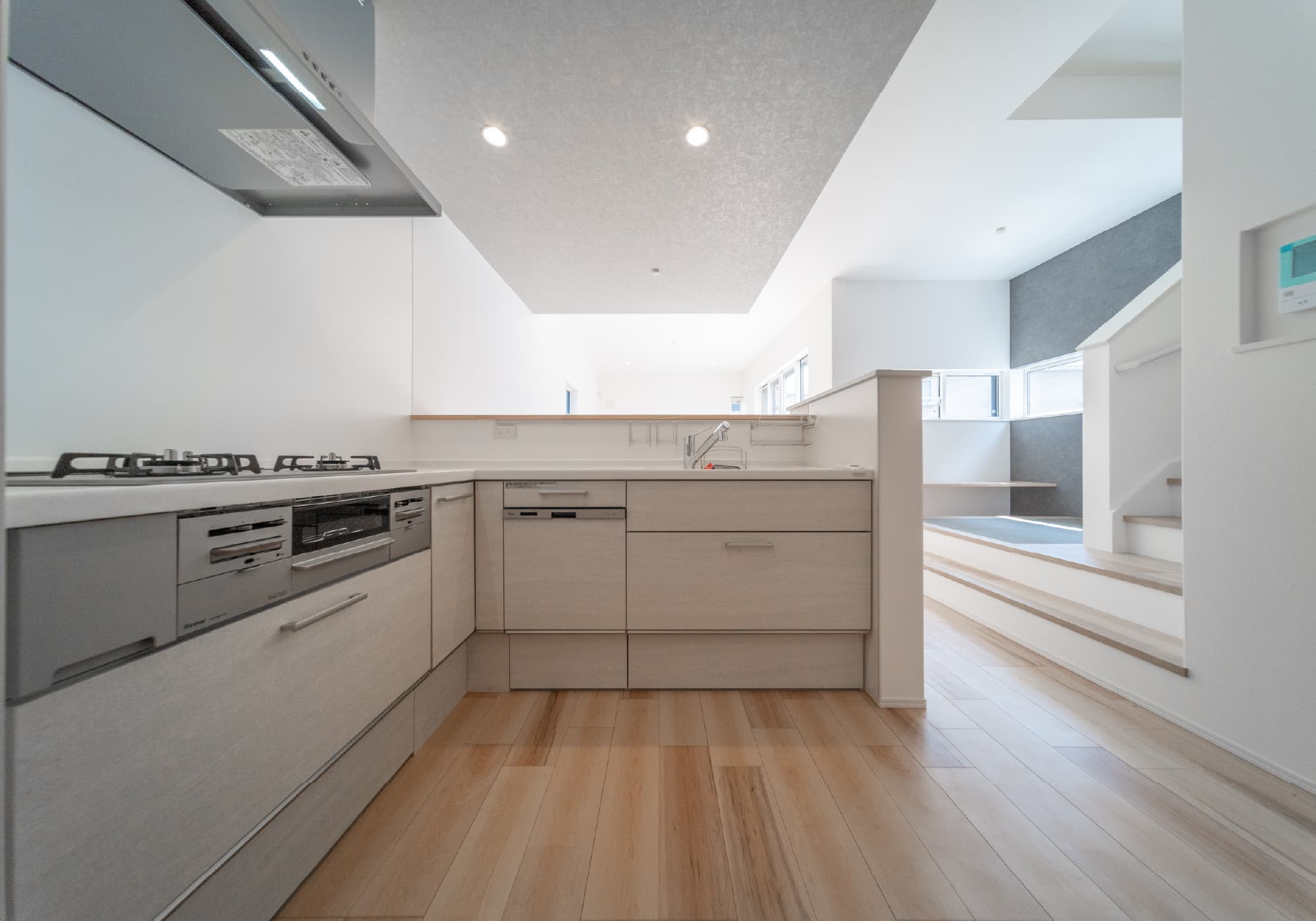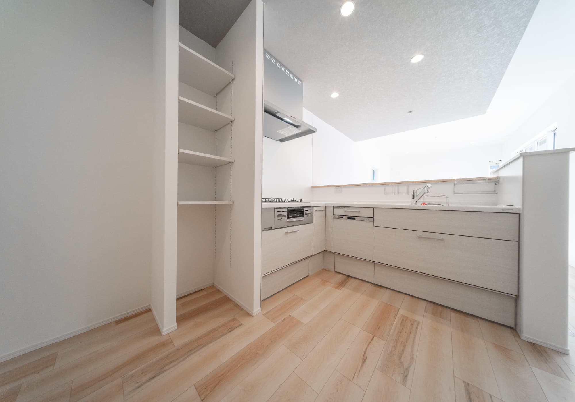 【L型キッチン】動線が短く動きがスムーズなL型キッチン。広々カウンターで作業がはかどります。