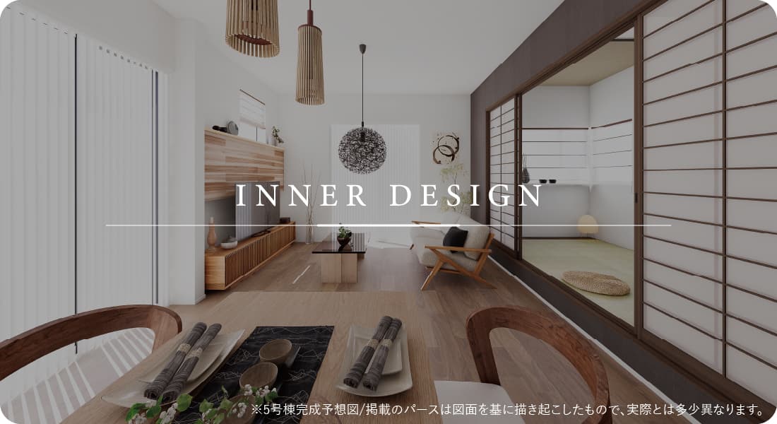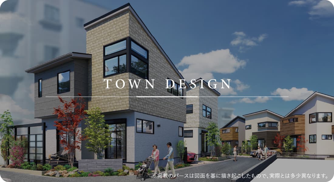 モダンな装いの全5邸が並ぶ街並み。左右に分かれた2つの街区には、それぞれ異なる素材感を採用。統一感のあるフォルムで調和し、優雅で一体的な景観をつくり出しています。