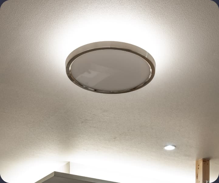 ![]() コーブ照明 光を天井に直接当て、反射した光で空間を照らします。光源が視界に入りにくく、柔らかな明るさが高級感のあるホテルライクな仕上がりになります。 ![]() コーニス照明 光を壁面に当てることで壁面を明るく照らしながら、昼間とは違った光の陰影を創出。空間に奥行きが生まれ、より広く感じさせる効果も期待できます。 ![]() スピーカー付ダウンライト 照明としての役割に加え、Bluetoothに接続して手軽に音楽を再生できるダウンライト。音楽を流すことで雰囲気を演出したり、様々なシーンを楽しめます。