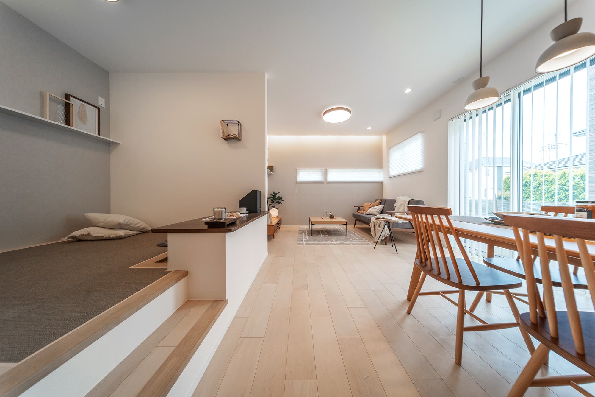 建築化照明によりあらかじめ設えた灯かりに、 自分の好みに合った照明アイテムを組み合わせることで空間を自由に演出。 ポラスのインテリアショールームでコーディネートの相談が可能です。