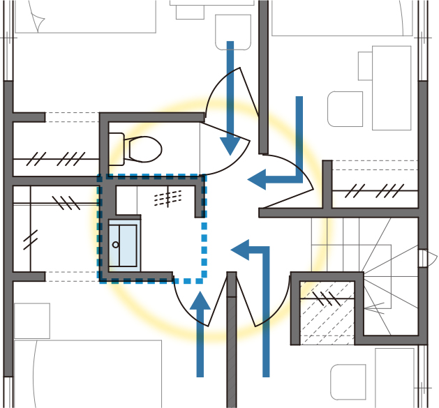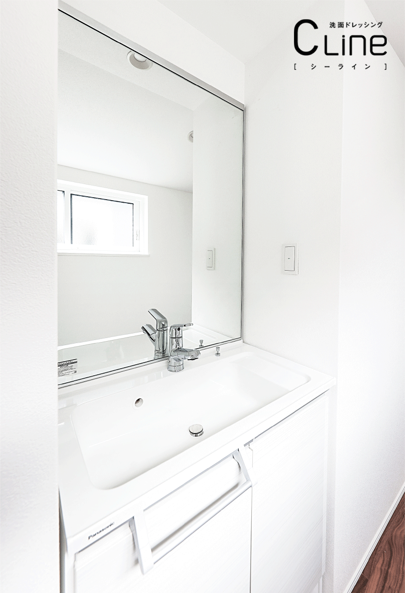 各居室からアクセスがしやすく、快適な動線を実現。1階の洗面と使い分けることで、忙しい朝や就寝前の支度による行列も緩和され、家族が増えても安心です。収納棚が近くにあるのでちょっとしたものも収納ができ、何気ない家事や日常使いに便利です。