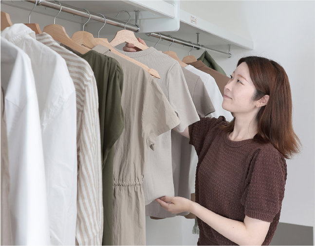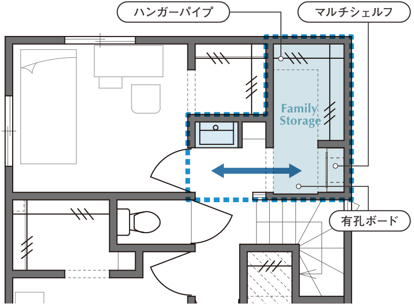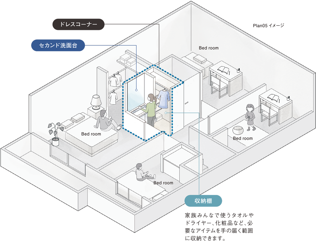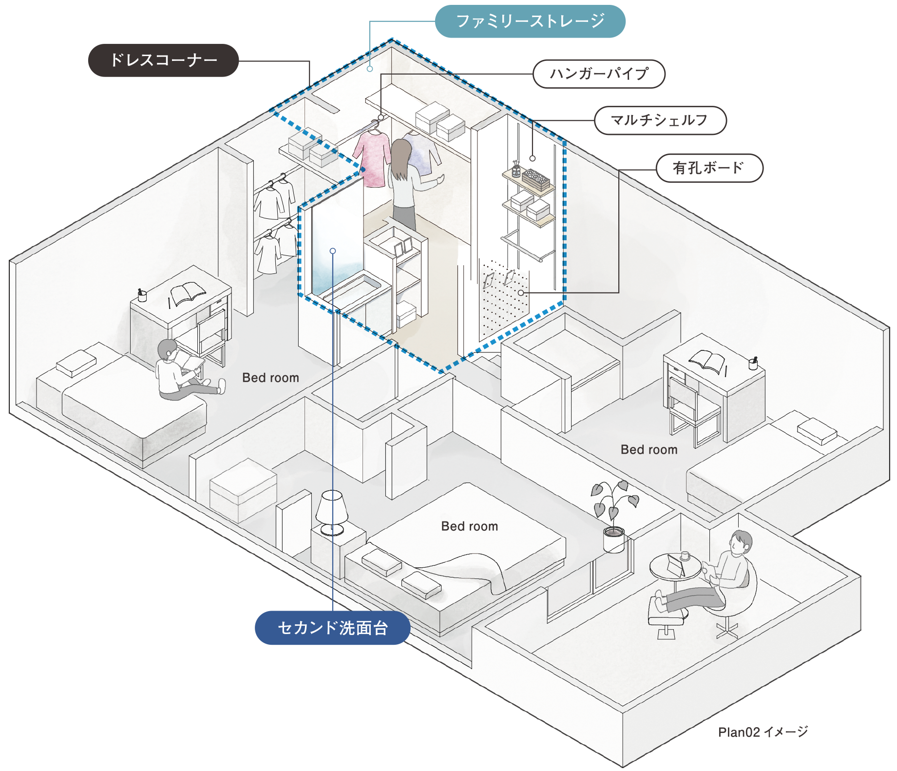 2階洗面台のそばに、+αの収納棚またはファミリーストレージを配した「ドレスコーナー」。身支度に必要なものを集約することで動線が短くなり、朝の支度がスムーズに。1階と2階で分けて使えば、混み合う朝でも快適。ちょっとした家事も2階で完結することで、暮らしにゆとりが生まれます。