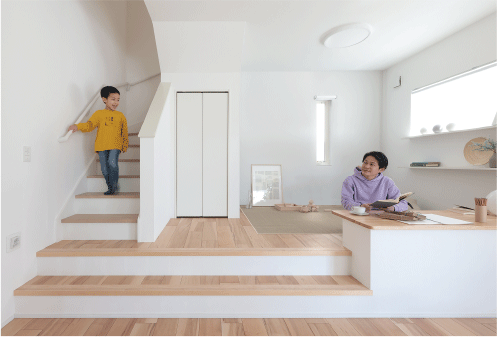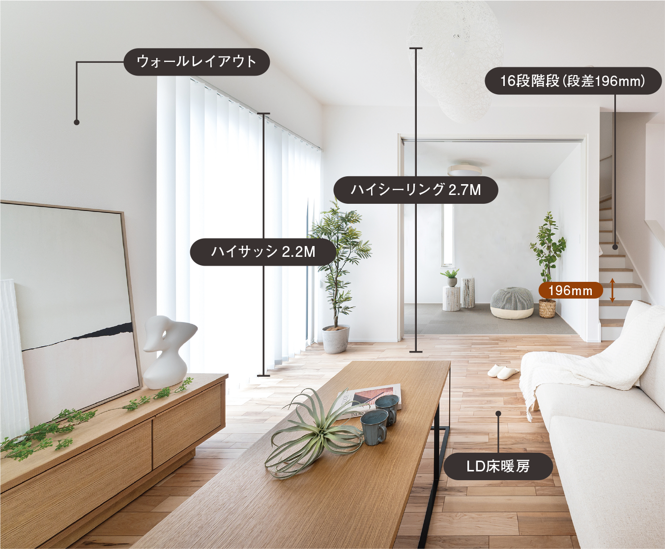 ![]() ウォールレイアウト 壁位置を高くし、採光に配慮しながら壁面も確保。大型TVにも対応。 | ![]() リビングアクセス・16段階段 楽に上り下りできる蹴上高を低くした階段。必ず家族が顔を合わせるレイアウトです。 |