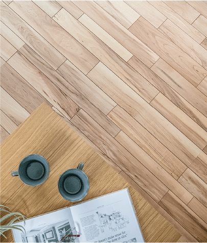 イクタラスティックランダムフロア(1階) サイズの異なるピースで構成された表面材が床に多彩な表情をもたらします。オイル塗装の風合いを宿したラスティック塗装により、耐久性とお手入れのしやすさを実現。 ※2階はアンビエントフロアになります。 | ![]() |