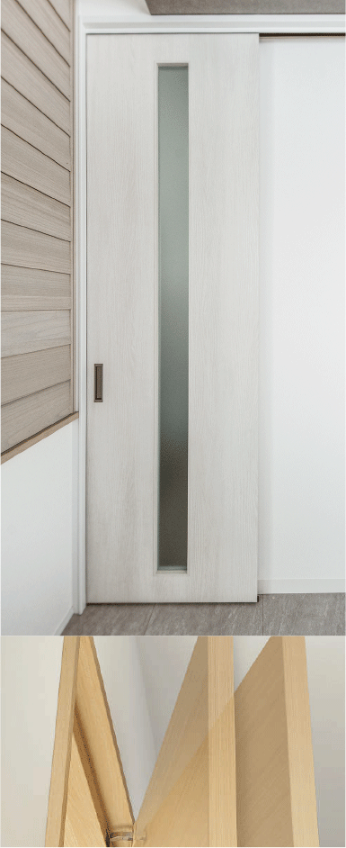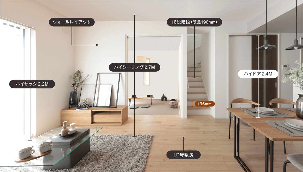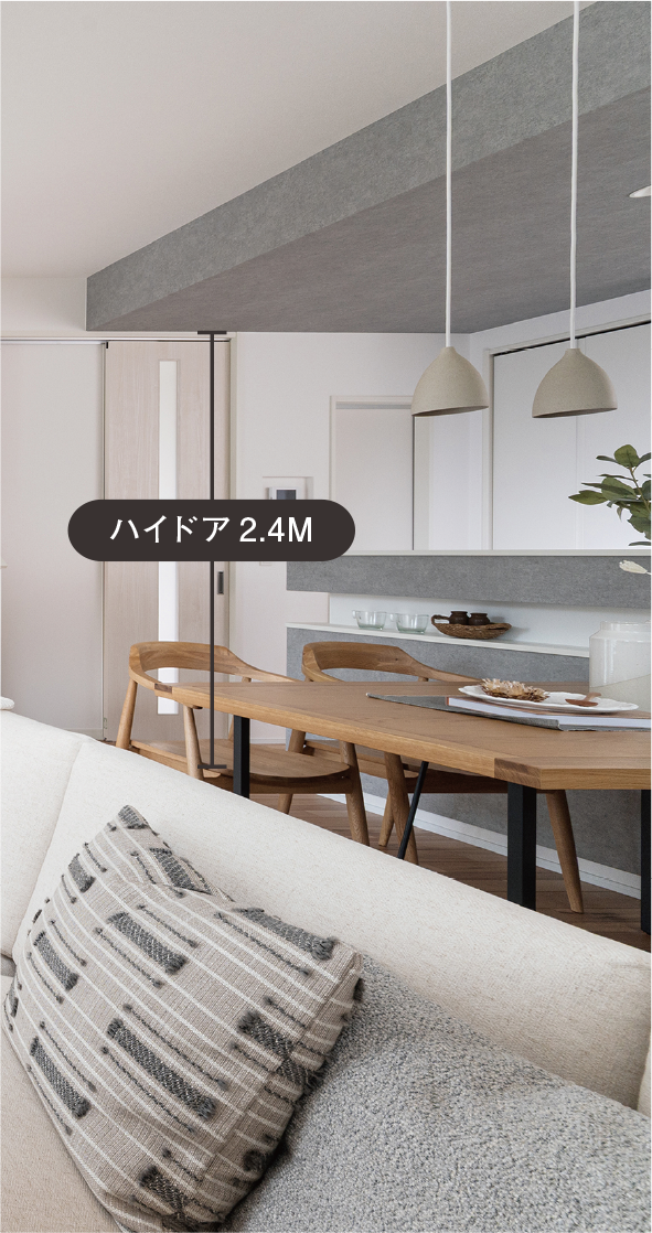 BASIC DESIGN ハイシーリング・ハイサッシ リビング・ダイニングの天井高は一般的な住宅(天井高2.4m)に比べて高い2.7mに設定。明るい光を取り込むハイサッシは2.2mを標準仕様にしています。 ※一部下がる場合があります。 ![]() 2.4Mハイドア リビングの開放感を演出する2.4mのハイドア。ゆっくり閉まるソフトモーション機能付き。 STORAGE LAYOUT<邸別設計> ![]()