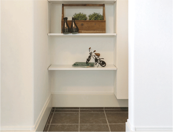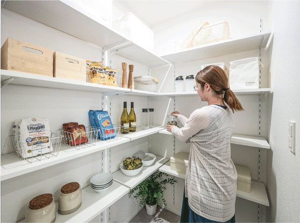 ![]() ウォークインパントリー 食品や調味料、場所をとりがちな調理家電の収納に便利なパントリーを配置。 ![]() 土間収納 アウトドアグッズなどを玄関からそのまましまえます。大きなものも出し入れがラクにできます。 ※掲載の写真はイメージです。 |