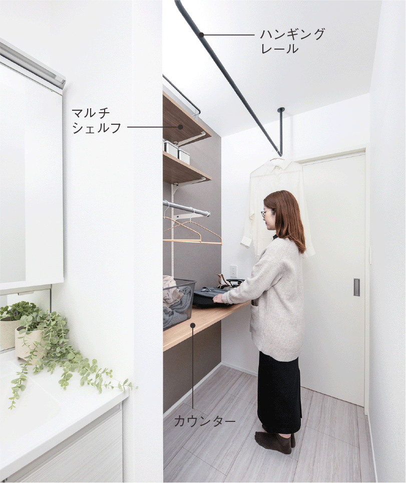 ユーティリア 洗濯動線が一箇所に集まったランドリールーム。便利に使えるカウンターやマルチシェルフ、部屋干しできるハンギングレールがあり、家事時短につながります。 | ![]() |