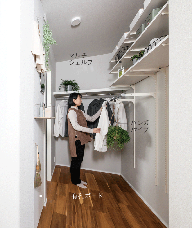 ファミリーストレージ 帰宅後すぐにコートやスーツ、キャリーケースなど収納できる大容量の収納。便利なハンガーパイプや有孔ボードを採用。お子様の片付け習慣も身に付きます。 | ![]() |