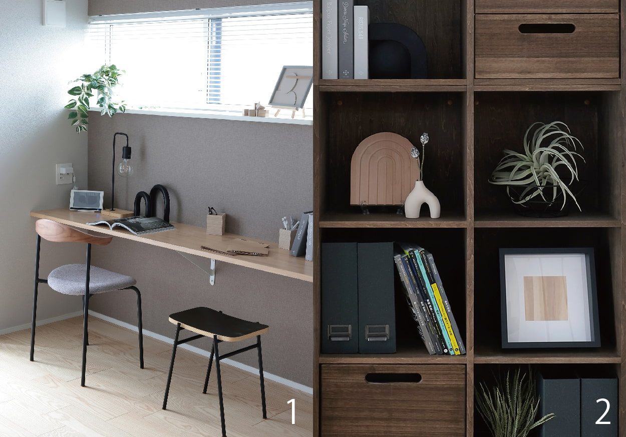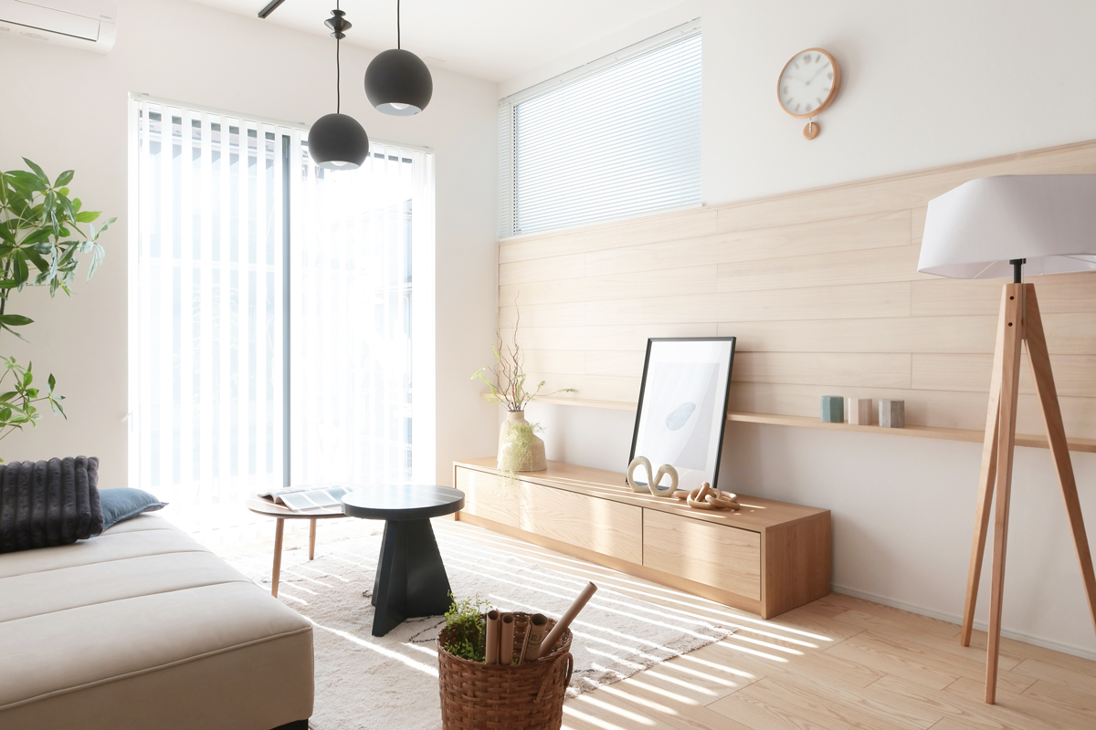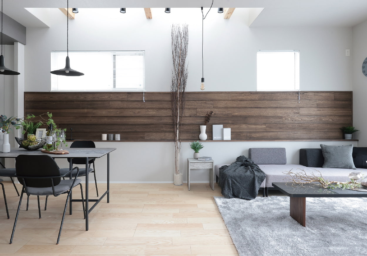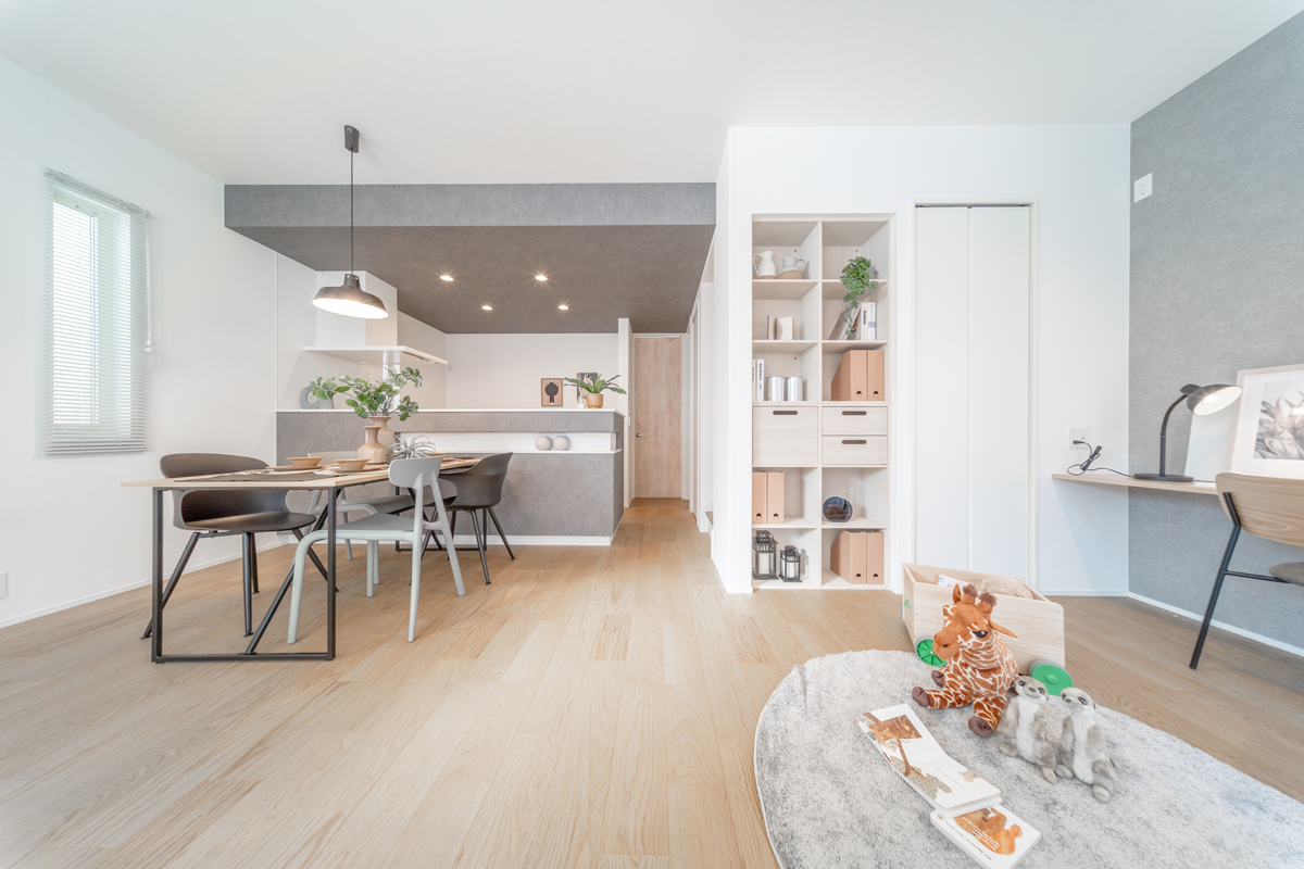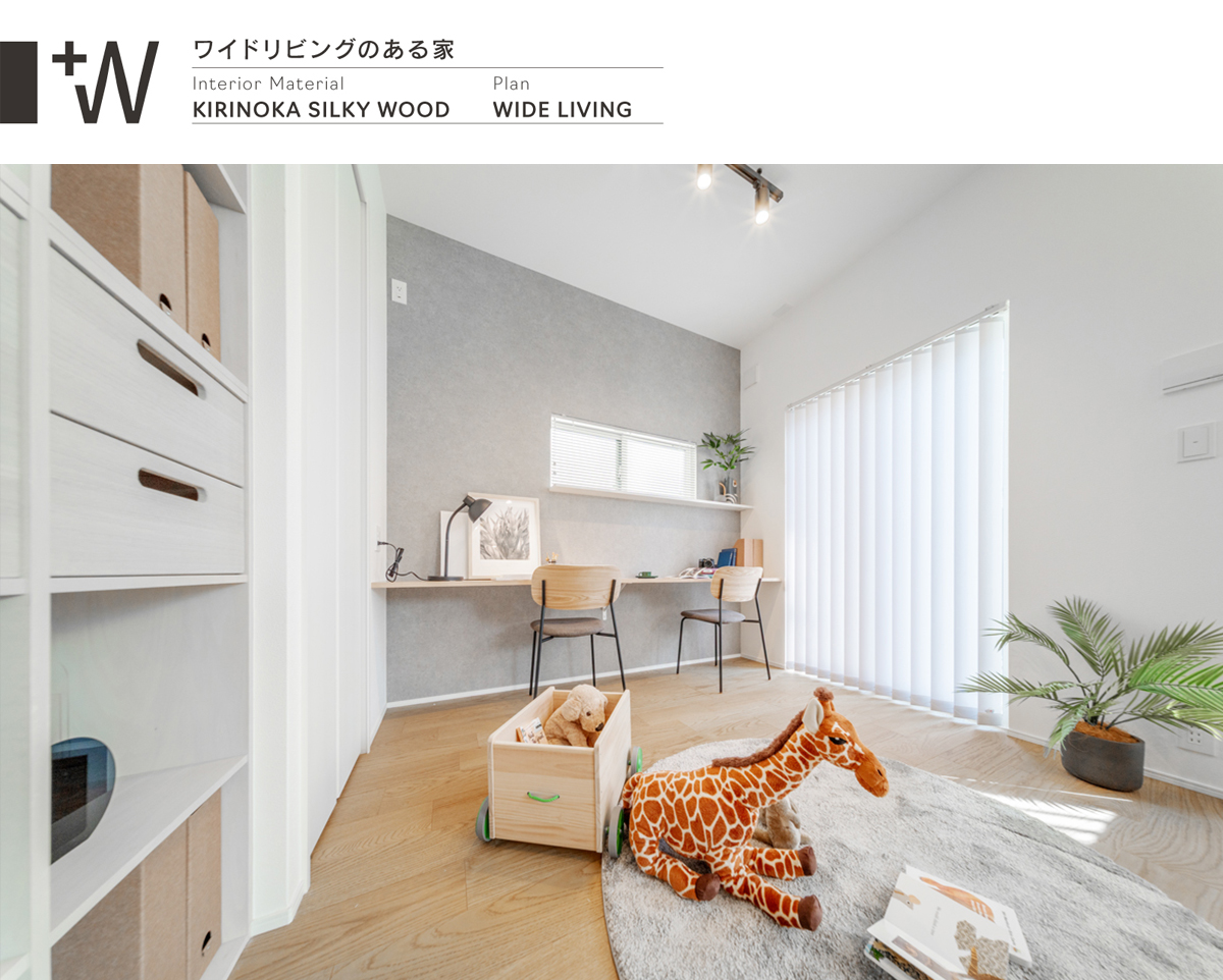 家具を置いてもゆとりのある20帖超の広々空間が暮らしの中心になる住まい。リビングの壁やブックシェルフには、桐のオリジナル建材KIRINOKA シルキーウッドを採用。桐の趣やしっとりとした肌ざわりを味わいながら、ゆったりと流れる時間を楽しめます。