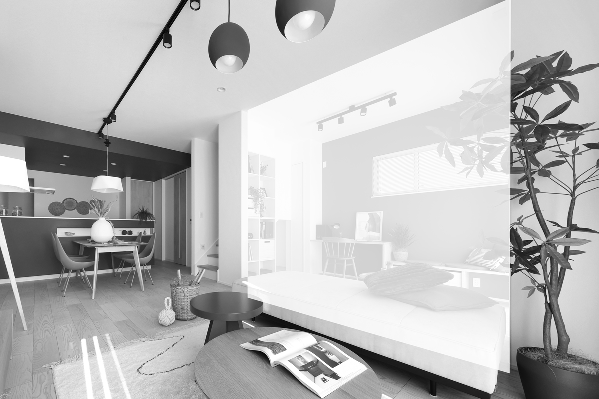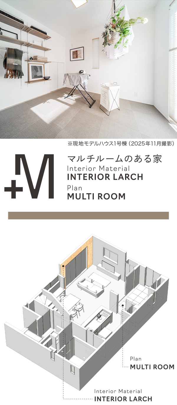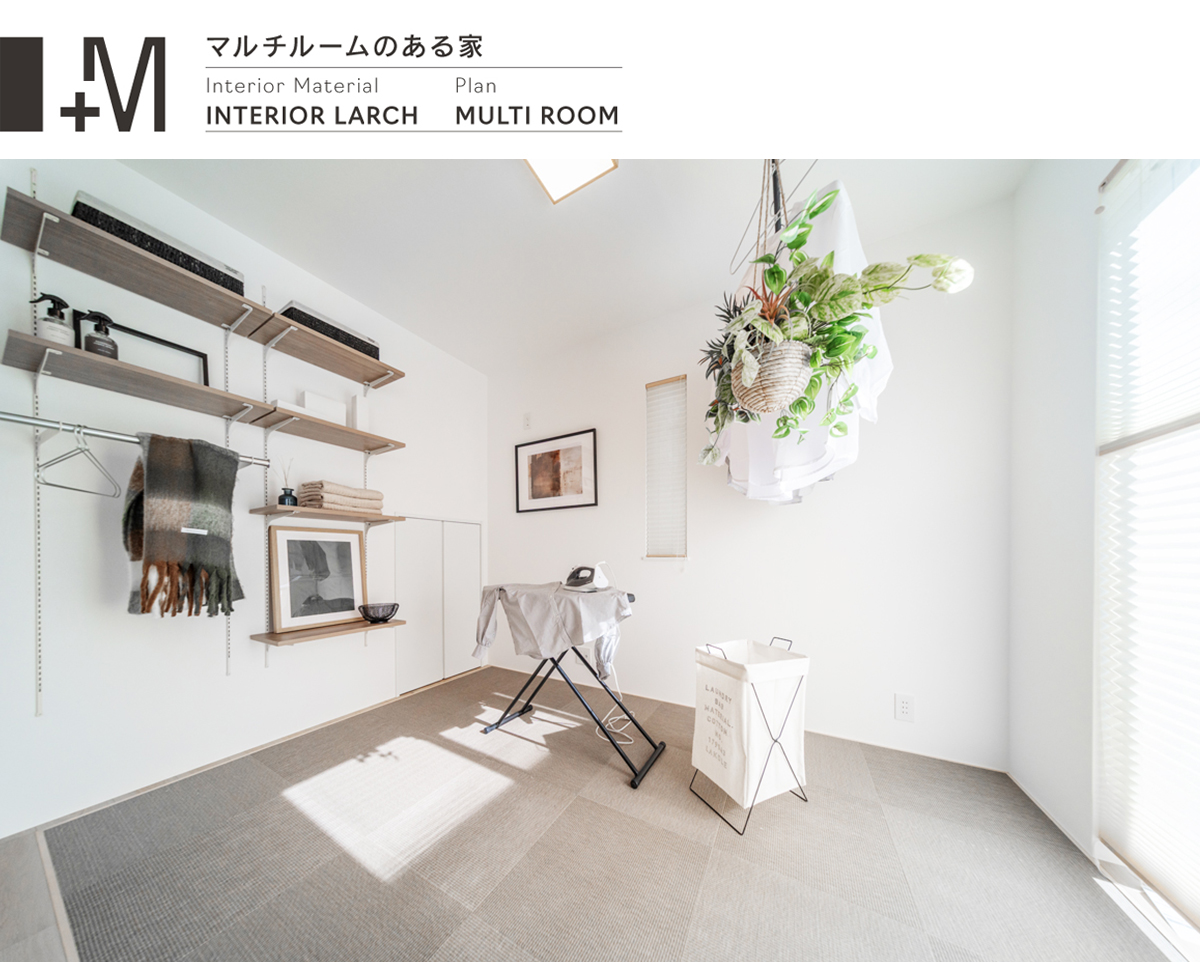 リビングには壁から天井まで国産檜のなめらかな木目が広がるインテリアラーチを採用。高天井の開放感に加えて、美しい木目が陽光や照明に映え、大らかな寛ぎにつつまれます。お隣のマルチルームは、続き間にも仕事場や家事室にもなる自在さで暮らしを輝かせます。