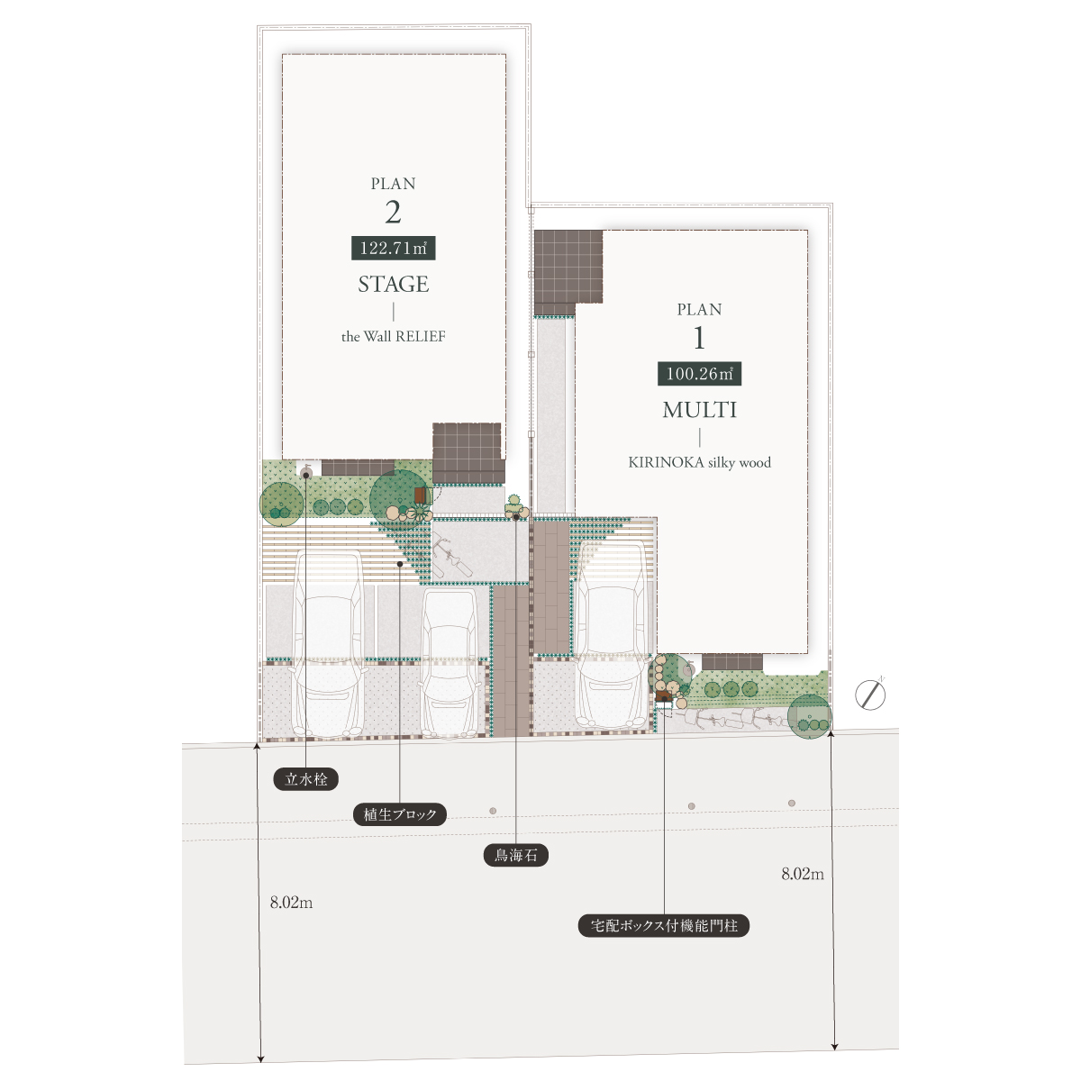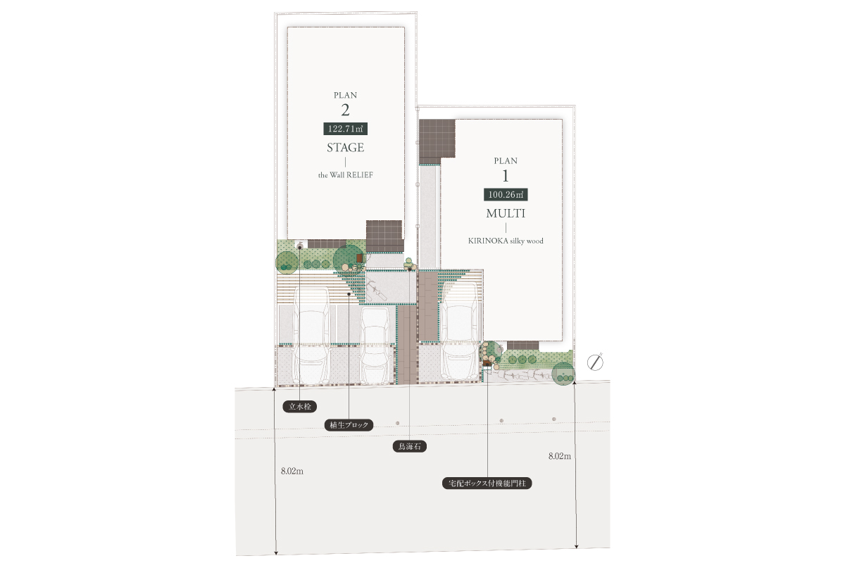 穏やかな住宅街に誕生する2邸。印象的な外観と呼応するように、高木や低木、下草を重ね豊かな街並を描き出します。カースペースの一部には植生ブロックを施し、時の移ろいとともに緑が息づき、成熟していくランドスケープを創出。住まうほどに美しさが深まる、永く愛される景観をデザインしました。
