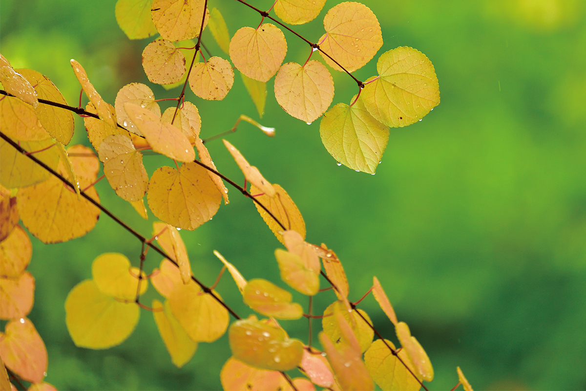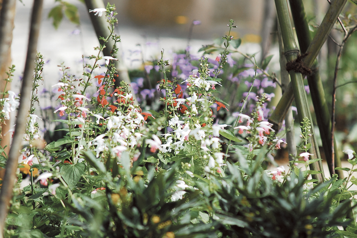 印象的な外観と呼応するように、高木や低木、下草を重ね豊かな街並を描き出します。
