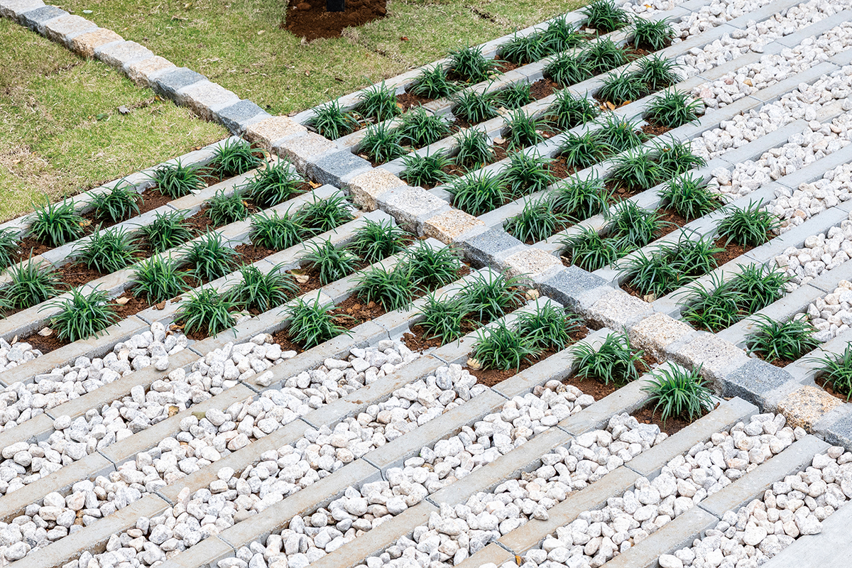 カースペースの一部には植生ブロックを施し、時の移ろいとともに緑が息づき、成熟していくランドスケープを創出。