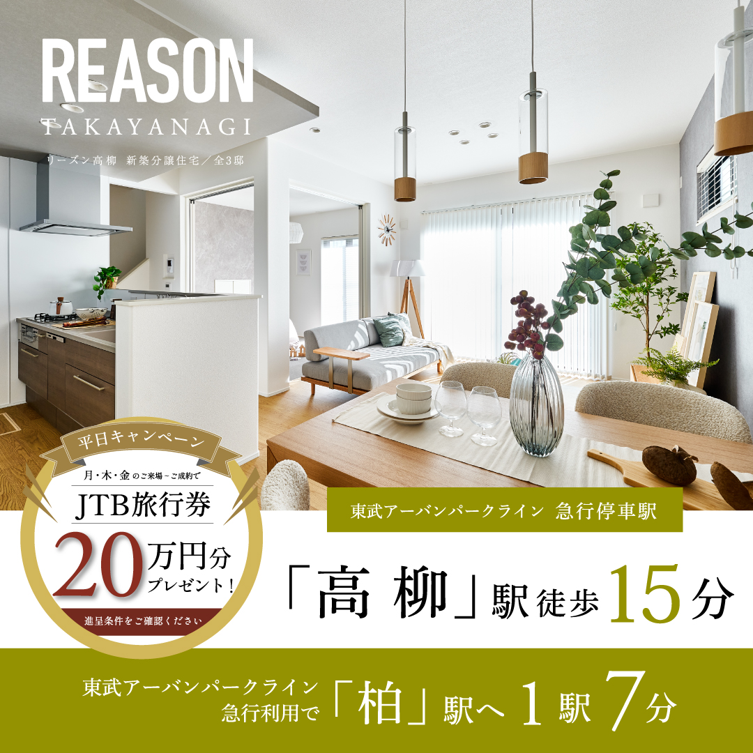 〈モデルハウス完成〉見学要約受付中!!■東武アーバンパークライン・「高柳」駅徒歩15分・「六実」駅徒歩15分・「柏」駅まで急行1駅7分☆★平日のご成約キャンペーン★☆ご来場~ご契約まですべて平日(月・木・金)にご対応頂いた方にご成約特典としてJTB旅行券20万円分プレゼント!!※予定数に達し次第、予告なく終了となる場合がございます。