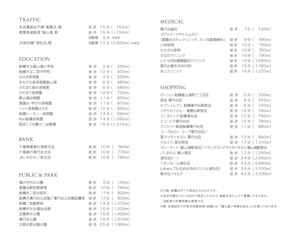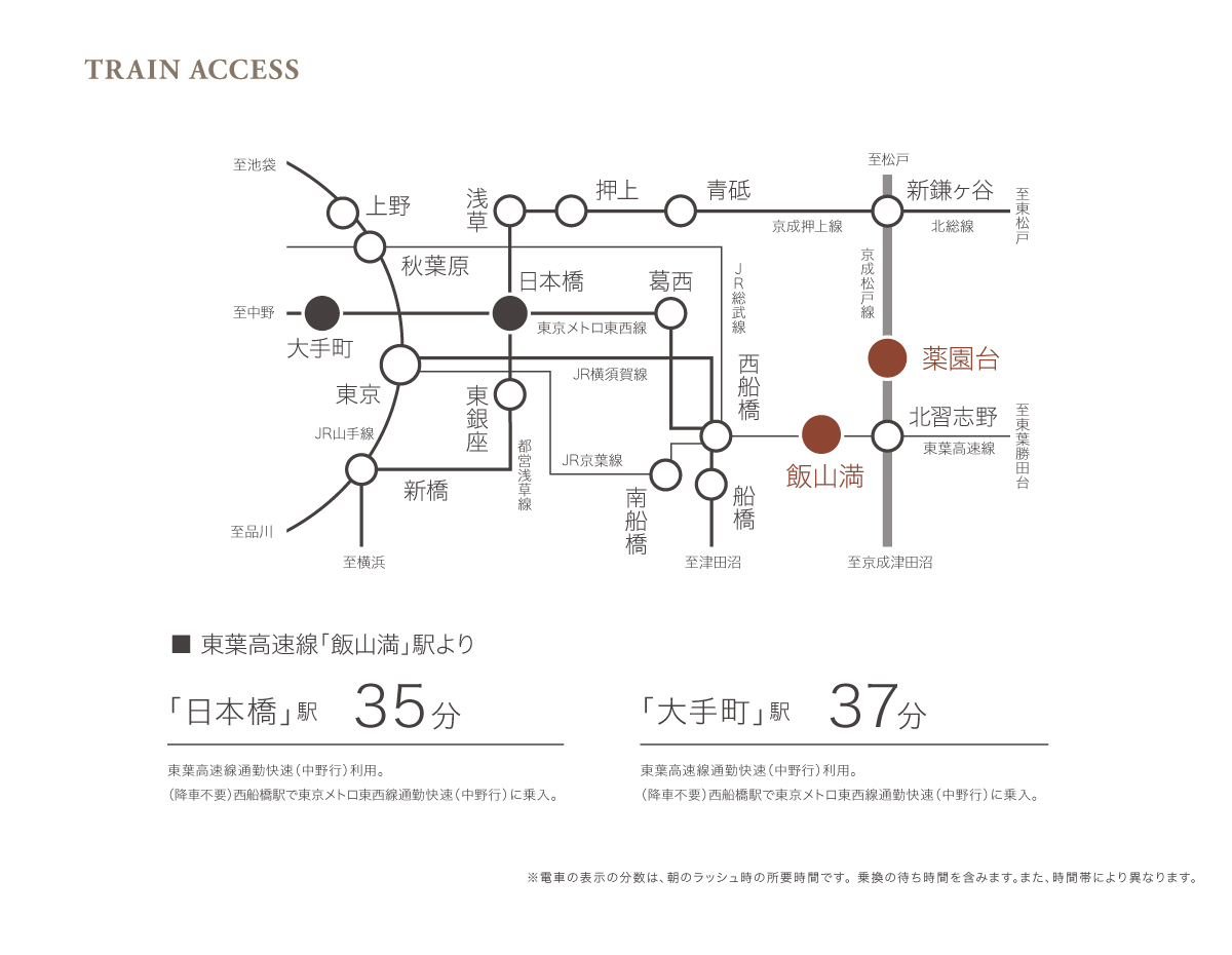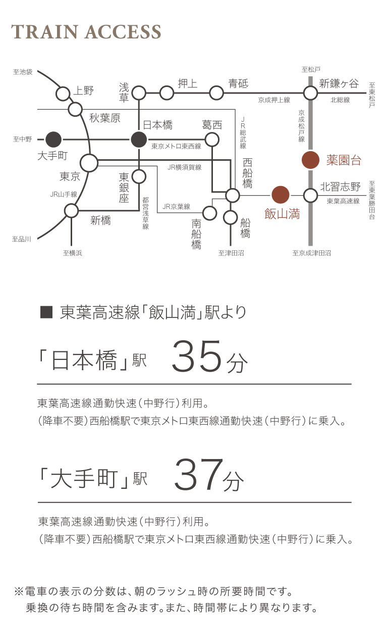 アクセス ●飯山満駅より日本橋駅まで【ラッシュ時: 35分 東葉高速線通勤快速(中野行)利用。(降車不要)西船橋駅で東京メトロ東西線通勤快速(中野行)に乗入。】【平常時: 30分 東葉高速線快速(中野行)利用。(降車不要)西船橋駅で東京メトロ東西線快速(中野行)に乗入。】