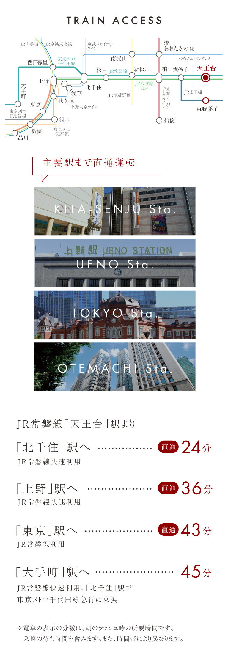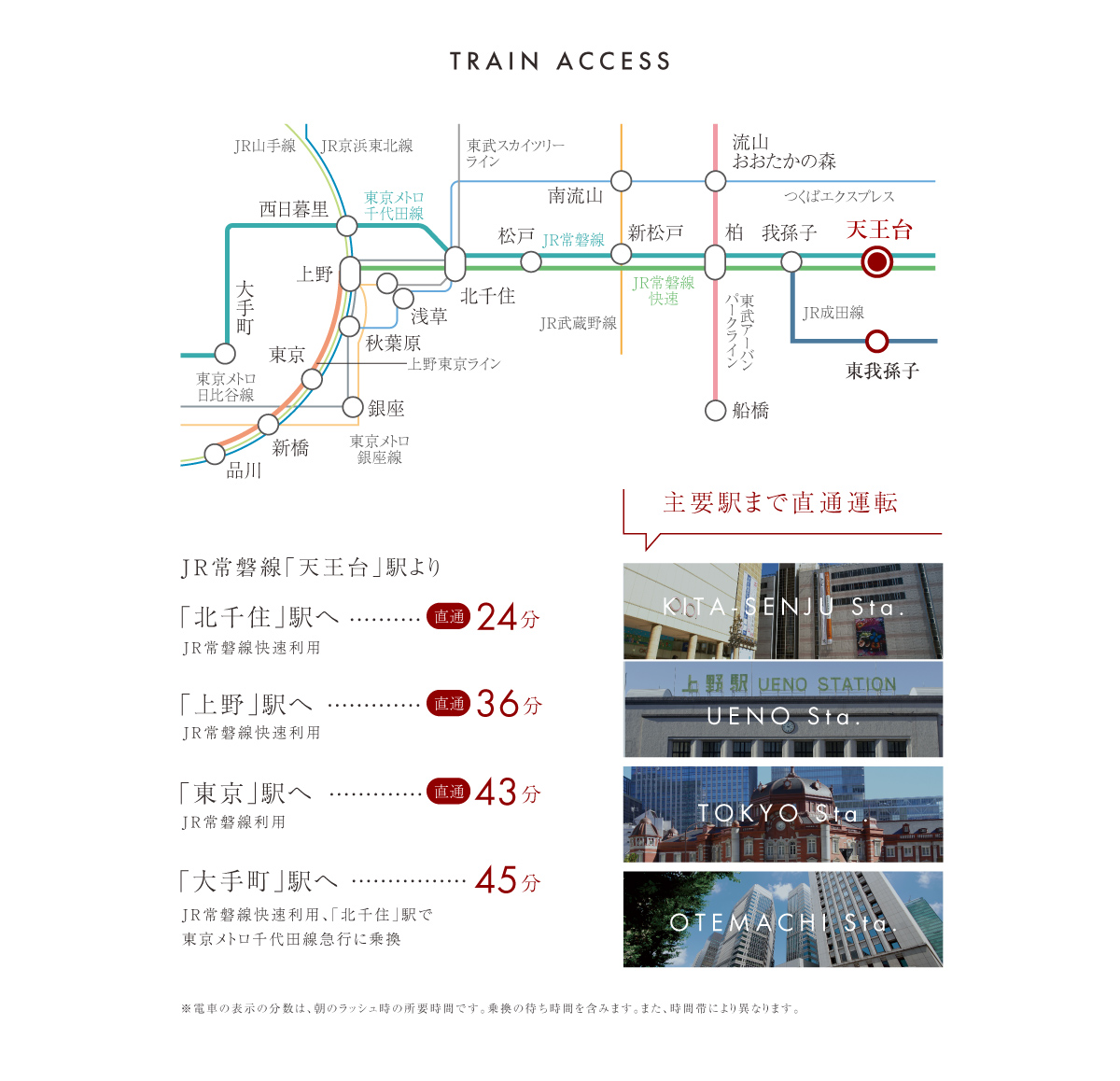 アクセス ●天王台駅より北千住駅まで【ラッシュ時: 24分 常磐線快速(上野行)利用。】【平常時: 23分 常磐線(品川行)利用。】