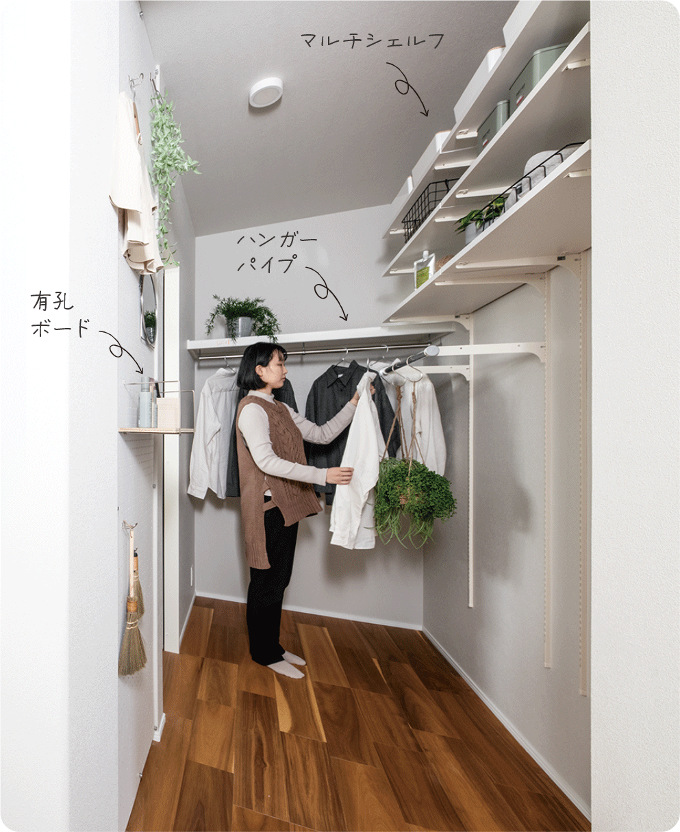 コートやスーツ、キャリーケースなど収納できる便利なハンガーパイプや有孔ボードを採用した大容量のファミリーストレージ。 帰宅後すぐにしまうことができ、お子様の片付け習慣が身に付きます。