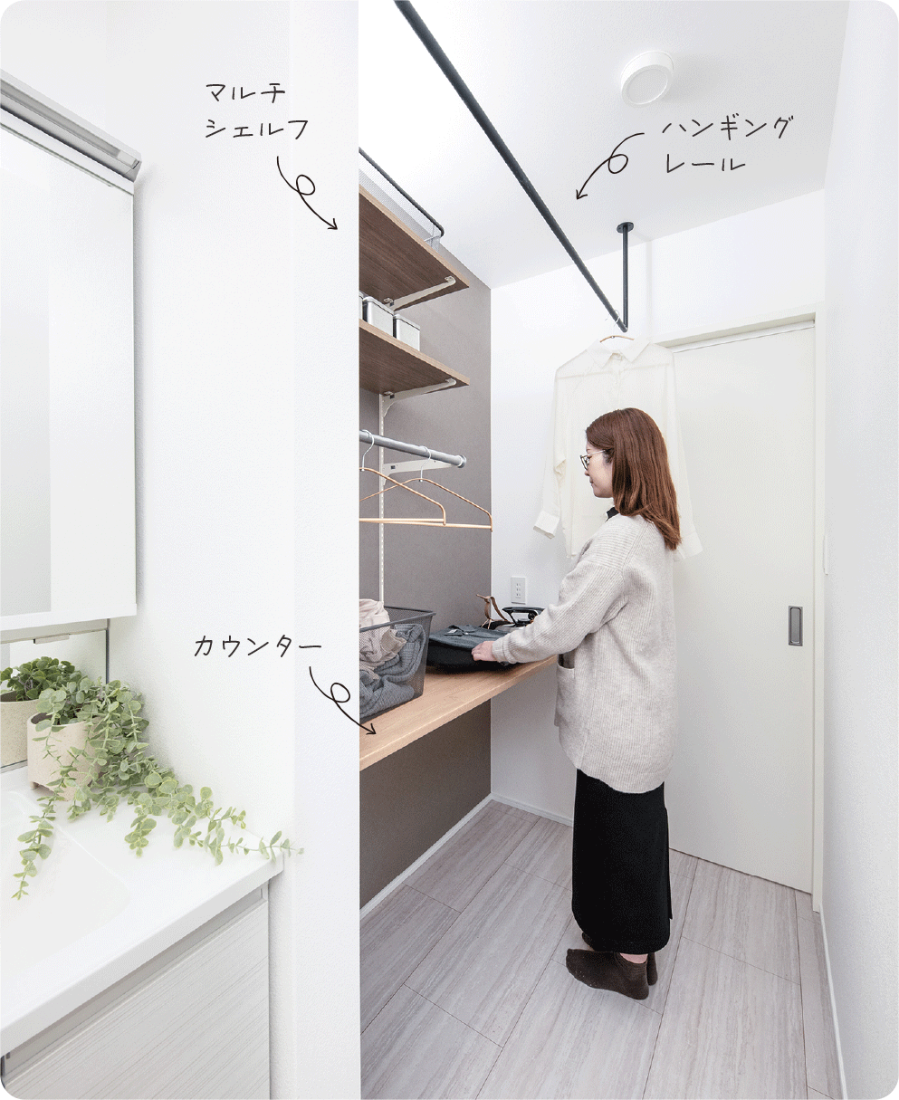 洗う・干す・たたむの動線が一箇所に集まったランドリールーム。便利に使えるカウンターやマルチシェルフ、部屋干しできるハンギングレールがあり、家事時短につながります。