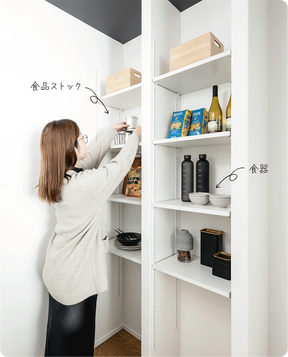 食品や調味料、場所をとりがちな調理家電の収納に便利なパントリーを配置。災害に備えて保存食を備蓄することもでき、もしもの際も安心の収納です。