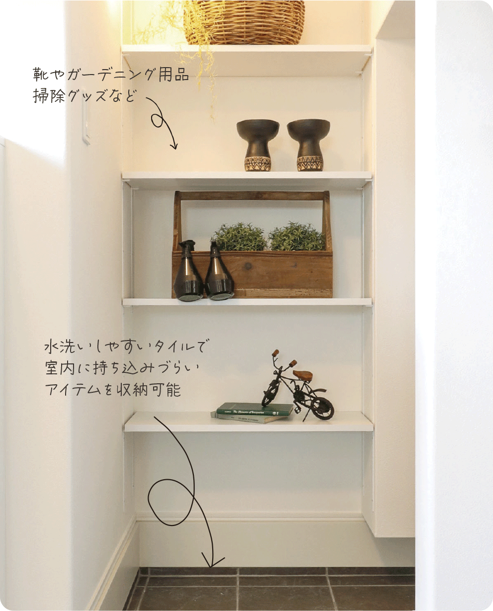 濡れた傘や趣味のアウトドアグッズなどを玄関からそのまましまえる土間収納。オープン収納によりベビーカーなどの大きなものも出し入れがラクにできます。