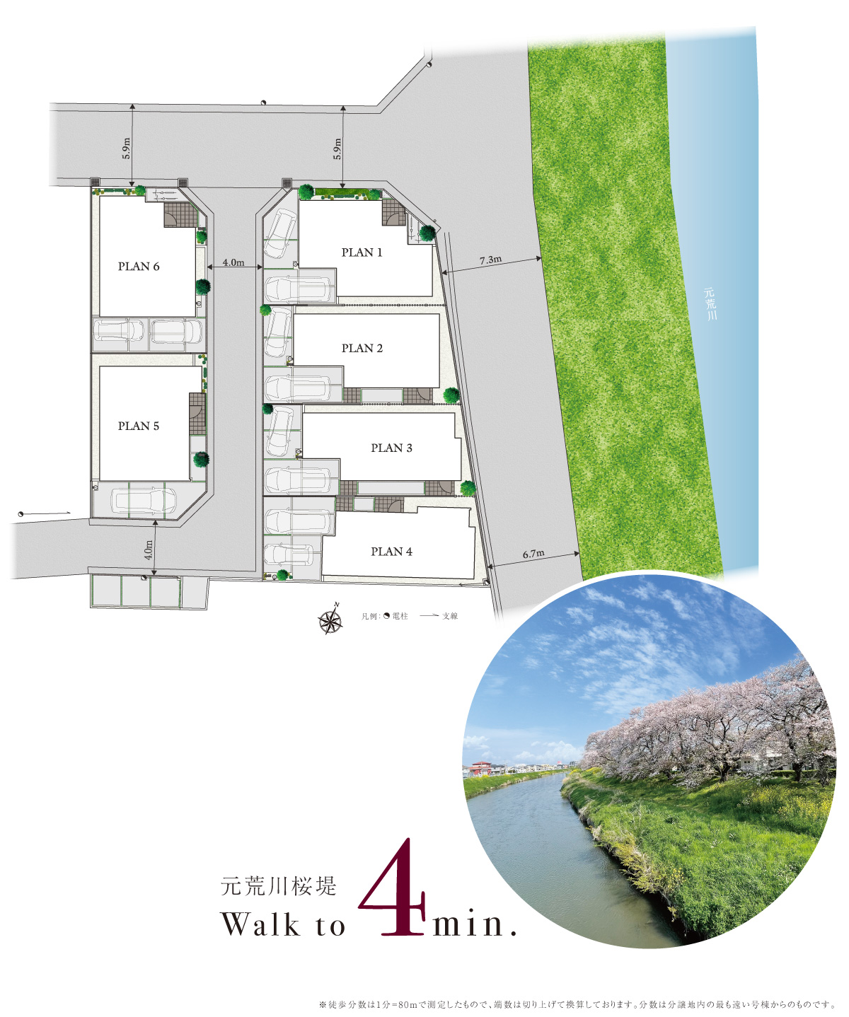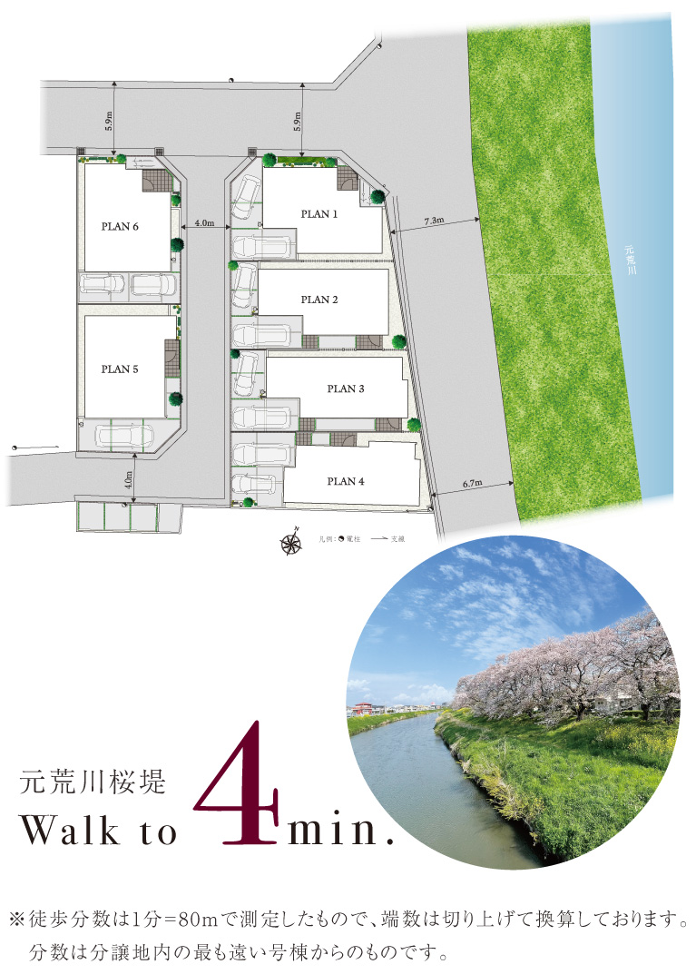 元荒川桜堤まで徒歩4分という清々しい自然を身近に感じられて、東側には道幅の広い道路が通るなど開放感に恵まれた立地。