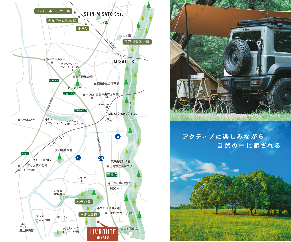 MISATO LOCATION カーライフも自然もアクティブに愉しむ暮らし 行きたくなったそのときに自然の中へ。そんな暮らしを始めてみませんか。 都内有数の水郷公園として知られる「みさと公園」が徒歩3分、そして「水元公園」が徒歩10分。 いつでも緑や水辺の風景に癒され、さらに「三郷JCT」も近いことから車のお出かけもスムーズです。 CAR LIFEもNATURE LIFEも楽しめる心躍る時間がこの街から奏でられていきます。 CAR LIFE ✕ NATURE LIFE |