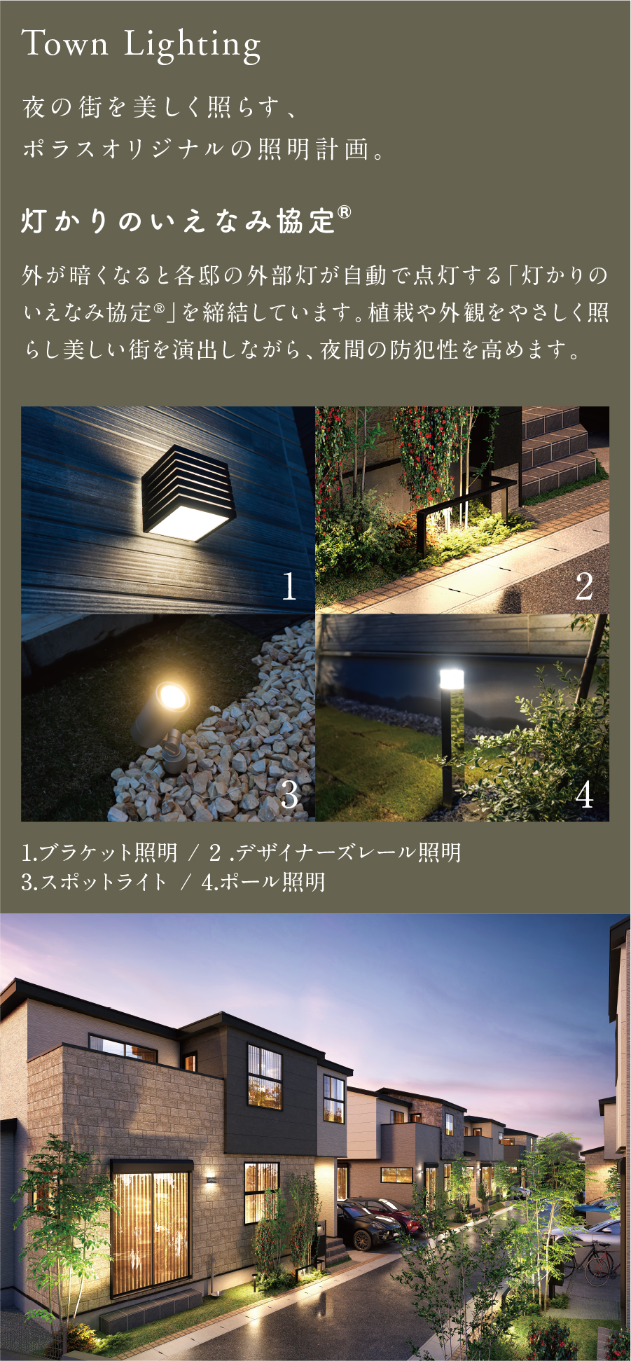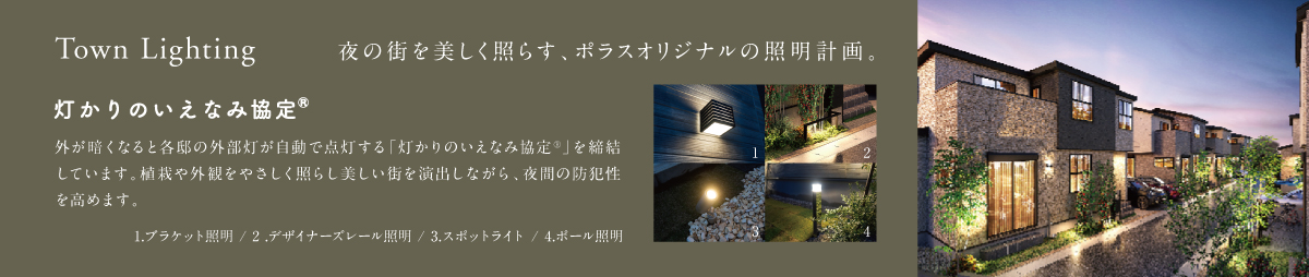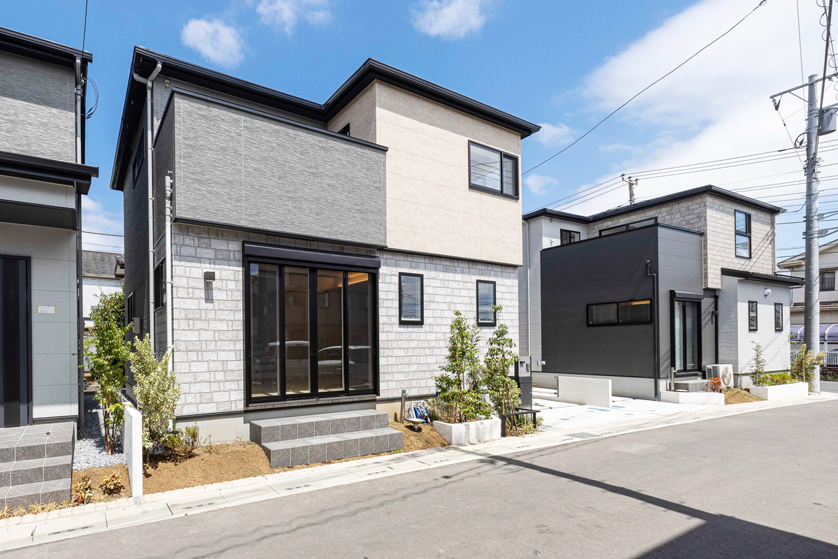 【モデルハウス公開中】暮らしを自分流に照らす、彩りあるライフスタイル、全7邸◇東武スカイツリーライン「大袋」駅徒歩20分、「北越谷」駅バス15分(「弥十郎公園入口」バス停徒歩3分)◆徒歩圏内に生活施設が集まる暮らしやすい街◇モダンな7邸が創出する美しい街並風家◆暮らしを満たす2スタイルの邸別設計・ステージリビング/リビングの一角にある段差空間・テキスタイルルーム/リビング続きで個室としても使える多目的ルーム◇多彩な照明が協奏する居心地のよいリビング・よくばりダウンライト・コープ照明・ライティングダクト(リビング)・フラットラインLED(バスルーム)◆ワンランク上の暮らしを叶える標準設計&アイテム