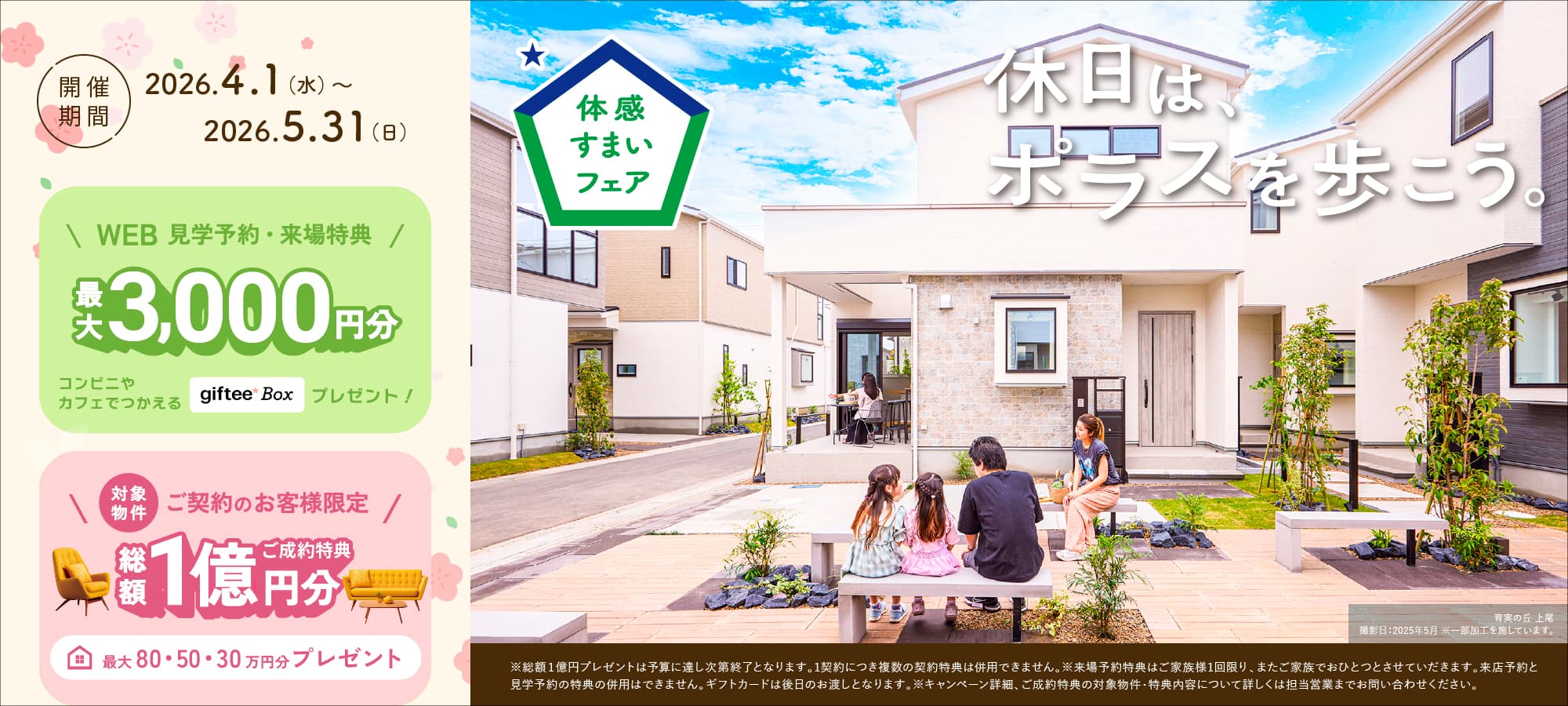 公式HPから見学予約の上ご来場いただいた方には、コンビニやカフェで使える【giftee Box(ギフティボックス)】最大3,000円分をプレゼント!