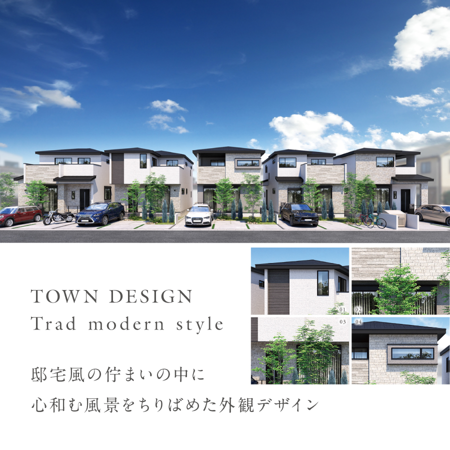◆邸宅風の佇まいの中に木目調や石目調のアクセントと表情豊かな窓形状が目を惹く美しい外観
