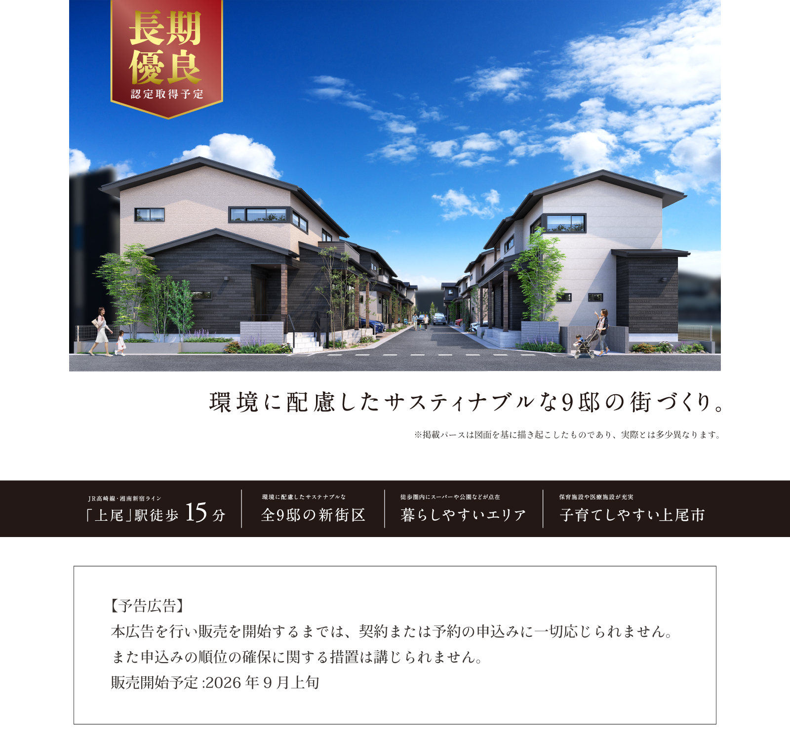 【予告広告】■JR高崎線・湘南新宿ライン「上尾」駅 徒歩15分■全9邸のサスティナブルな街■カースペース2台号棟あり■長期優良住宅認定取得予定◆ハイブリッド給湯器「エコワン」標準採用◆リビング・ダイニング「床暖房」標準設置◆1階掃き出し窓に電動シャッター標準設置
