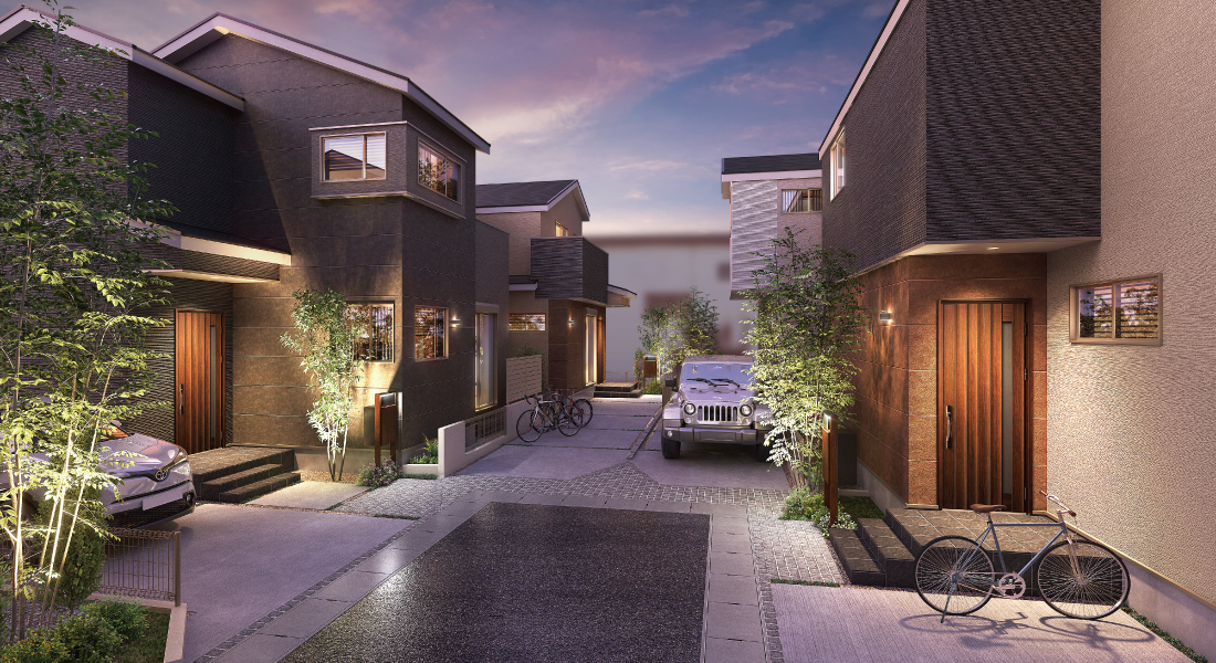 爽快な青空と陽光に映える、美しくモダンな4邸の街並風景。※掲載のパースは図面をもとに描き起こしたもので、実際とは多少異なります。