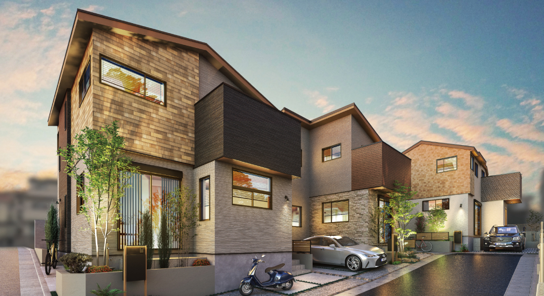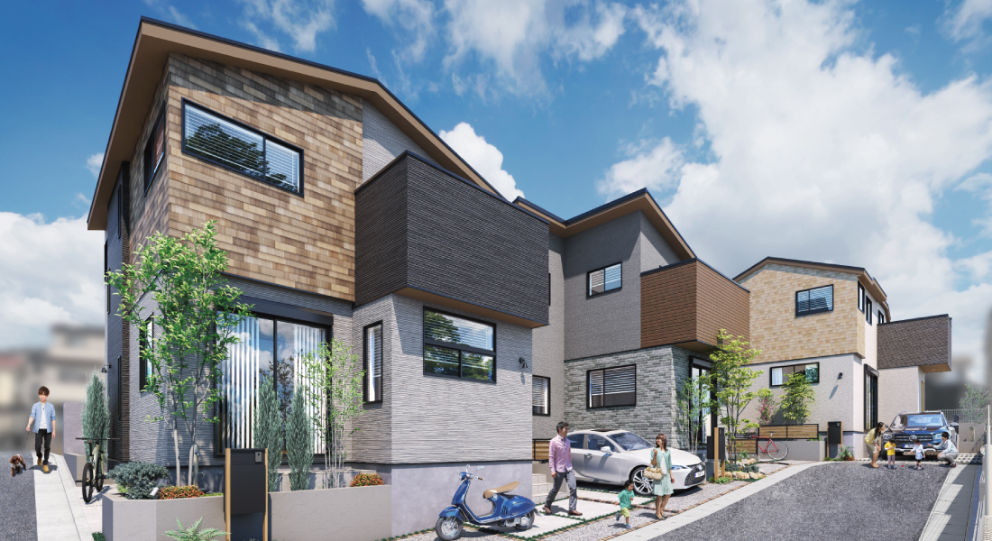 南ひな壇がもたらす陽光の恵みに移行全4邸。※掲載のパースは図面をもとに描き起こしたもので、実際とは多少異なります。