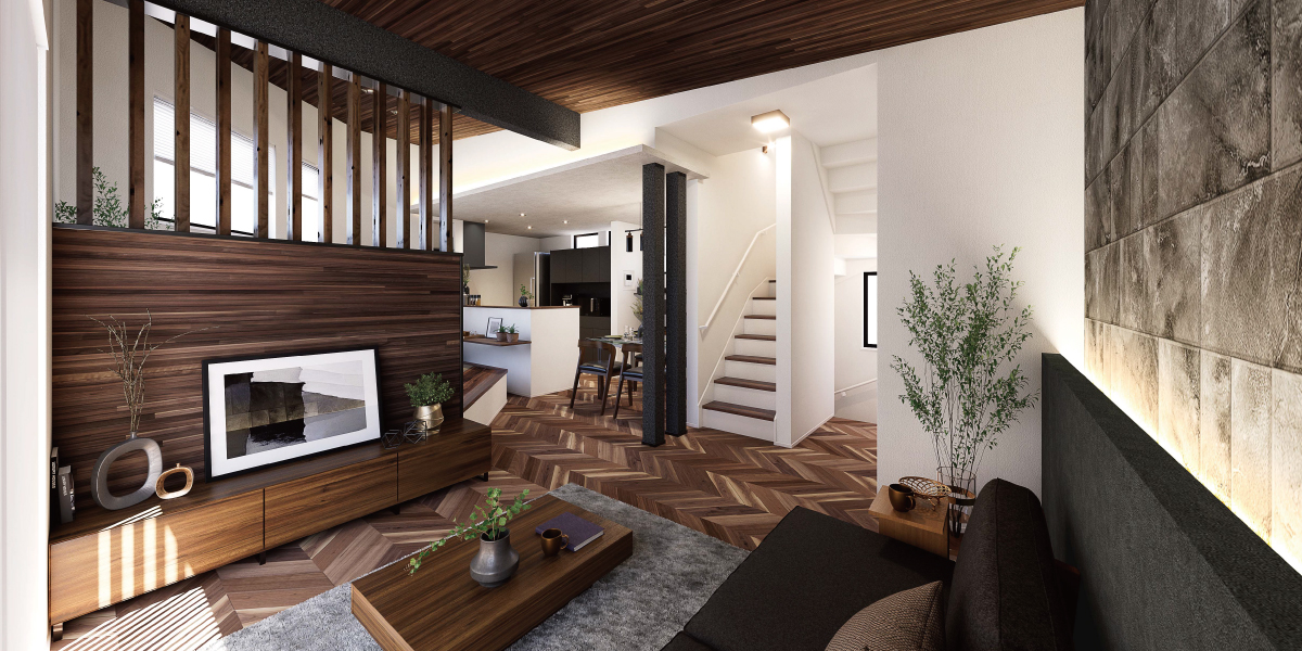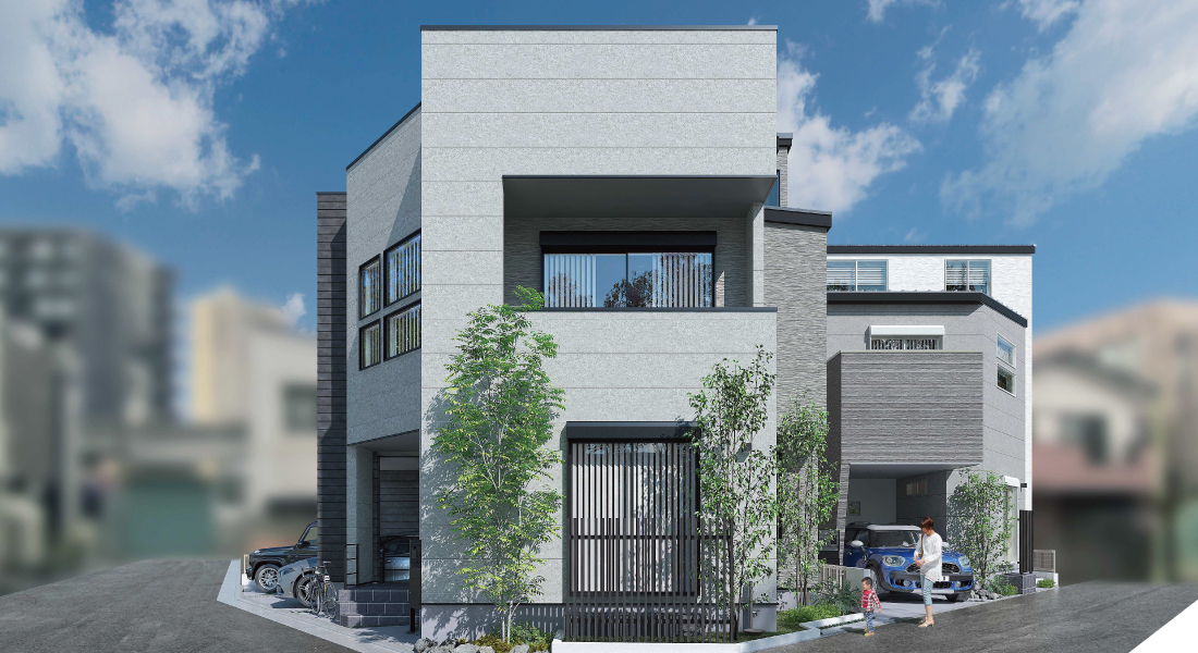 心地よい開放感に憩いモダンテイストが周辺の風景に映える住まい。※掲載のパースは図面をもとに描き起こしたもので、実際とは多少異なります。