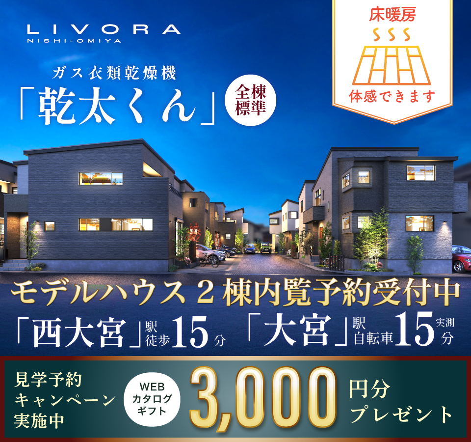 ★現地モデルハウス2棟完成!!内乱予約受付中★◆「西大宮」駅 徒歩15分の全13棟◆「大宮」駅 自転車15分(実測)◆小学校(許可校)・中学校・保育園が徒歩10分以内に揃う子育て世帯に嬉しい立地◆三橋総合公園まで徒歩17分◆ガス衣類乾燥機「乾太くん」全棟標準◆ビルトインの食器洗浄乾燥機【深型】全棟標準◆1階掃き出し窓に電動シャッター標準設置◆リビング・ダイニング「床暖房」標準設置◆ハイブリッド給湯器「エコワン」標準採用