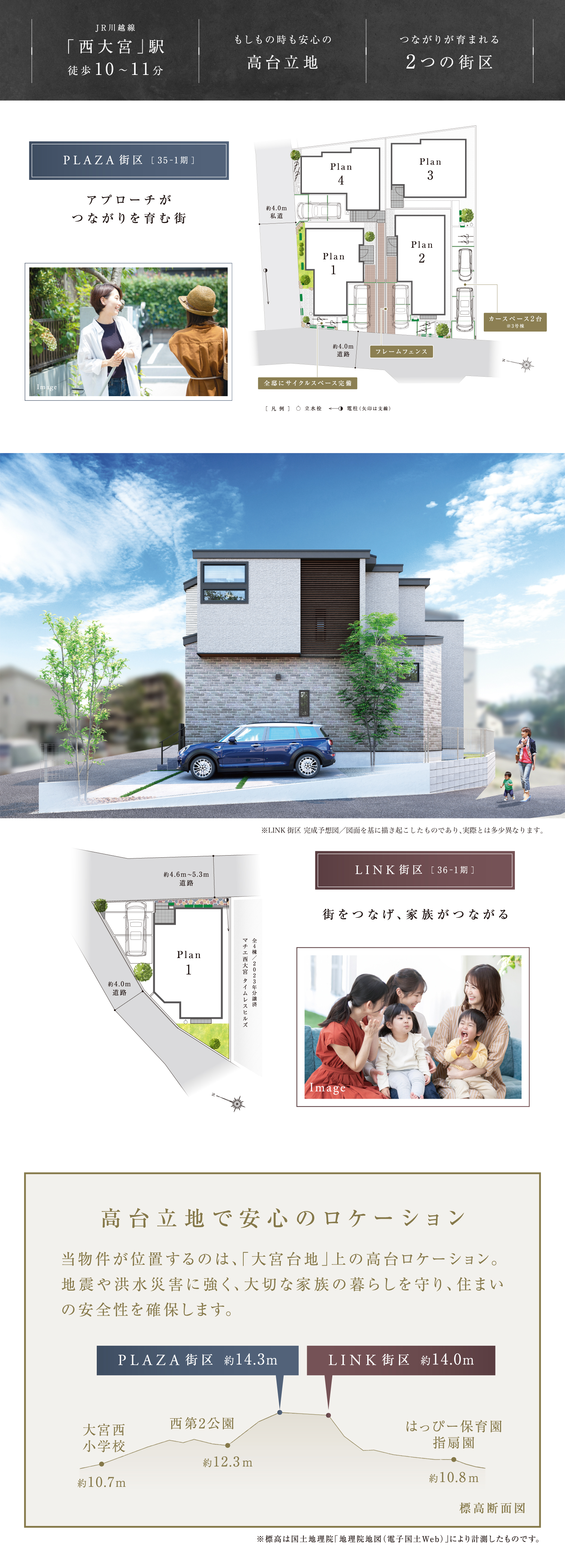 オープンスペースで住人同士がつながる“PLAZA街区”と、ポラスの新旧分譲地がつながる“LINK街区”。